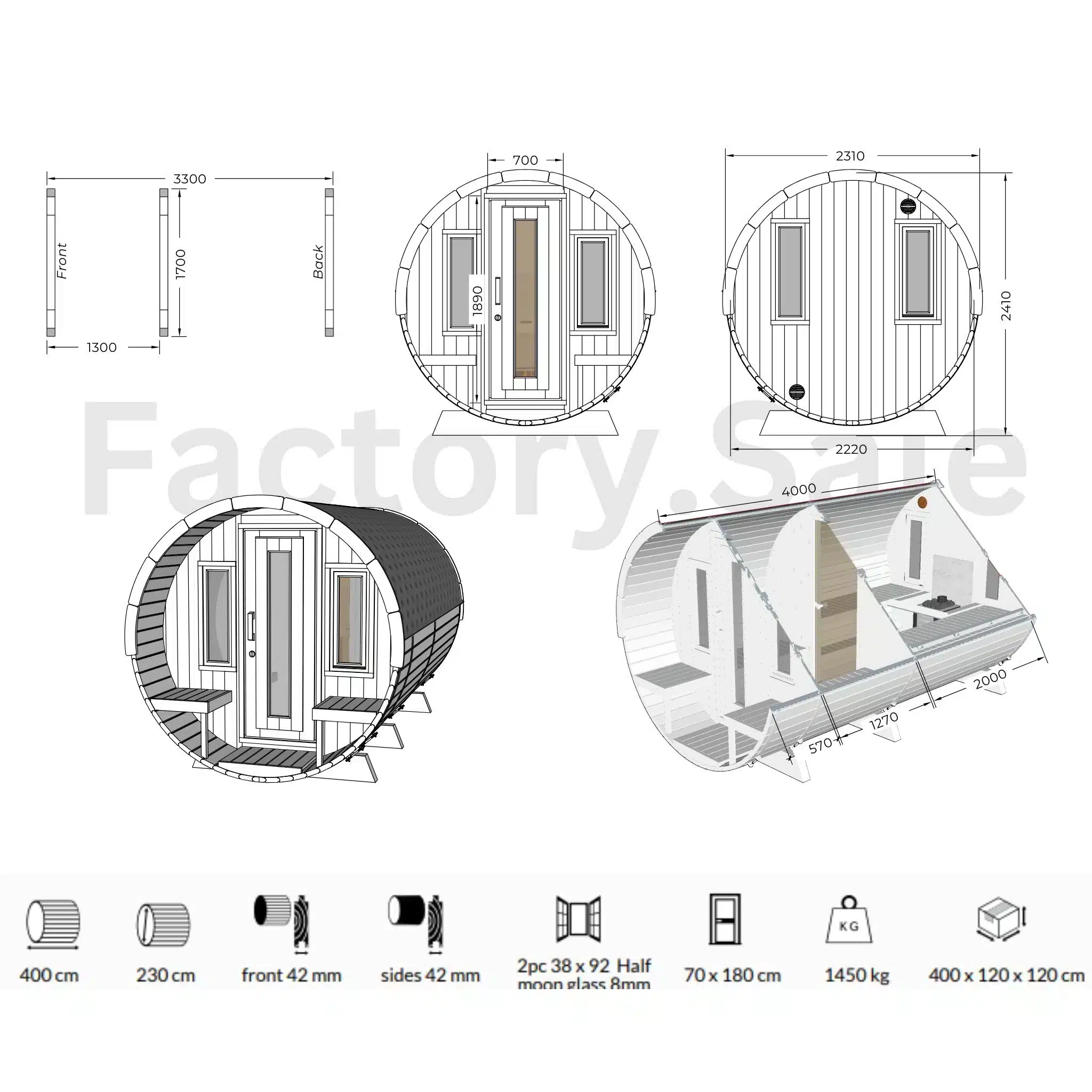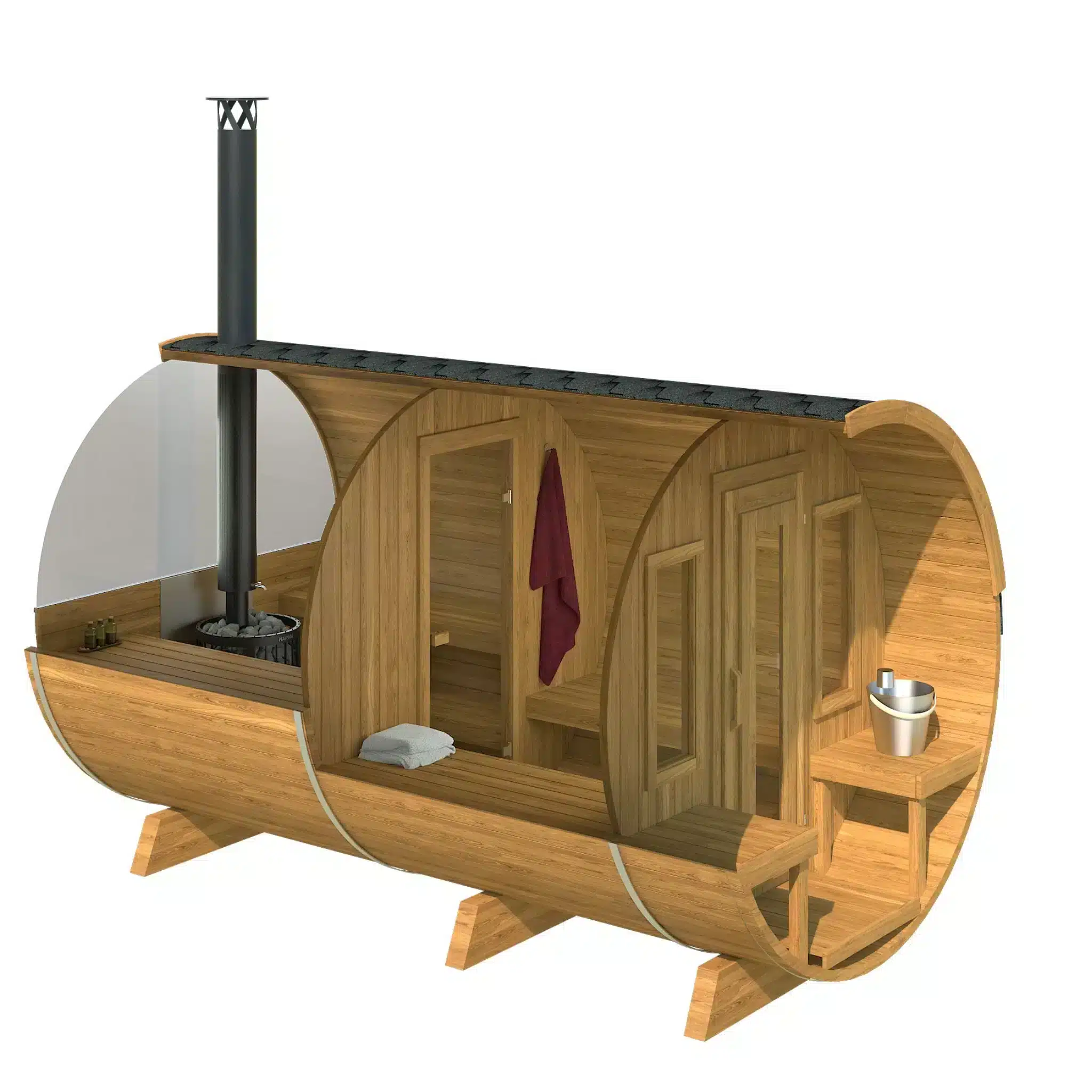 The unique design of the tube sauna ensures efficient heat circulation, allowing for fast and even heating. The half-moon glass window provides an exceptional view and allows natural light to flow into the sauna room, adding elegance and spaciousness. The sauna is built from durable wood, offering resistance to weather conditions and longevity for years.