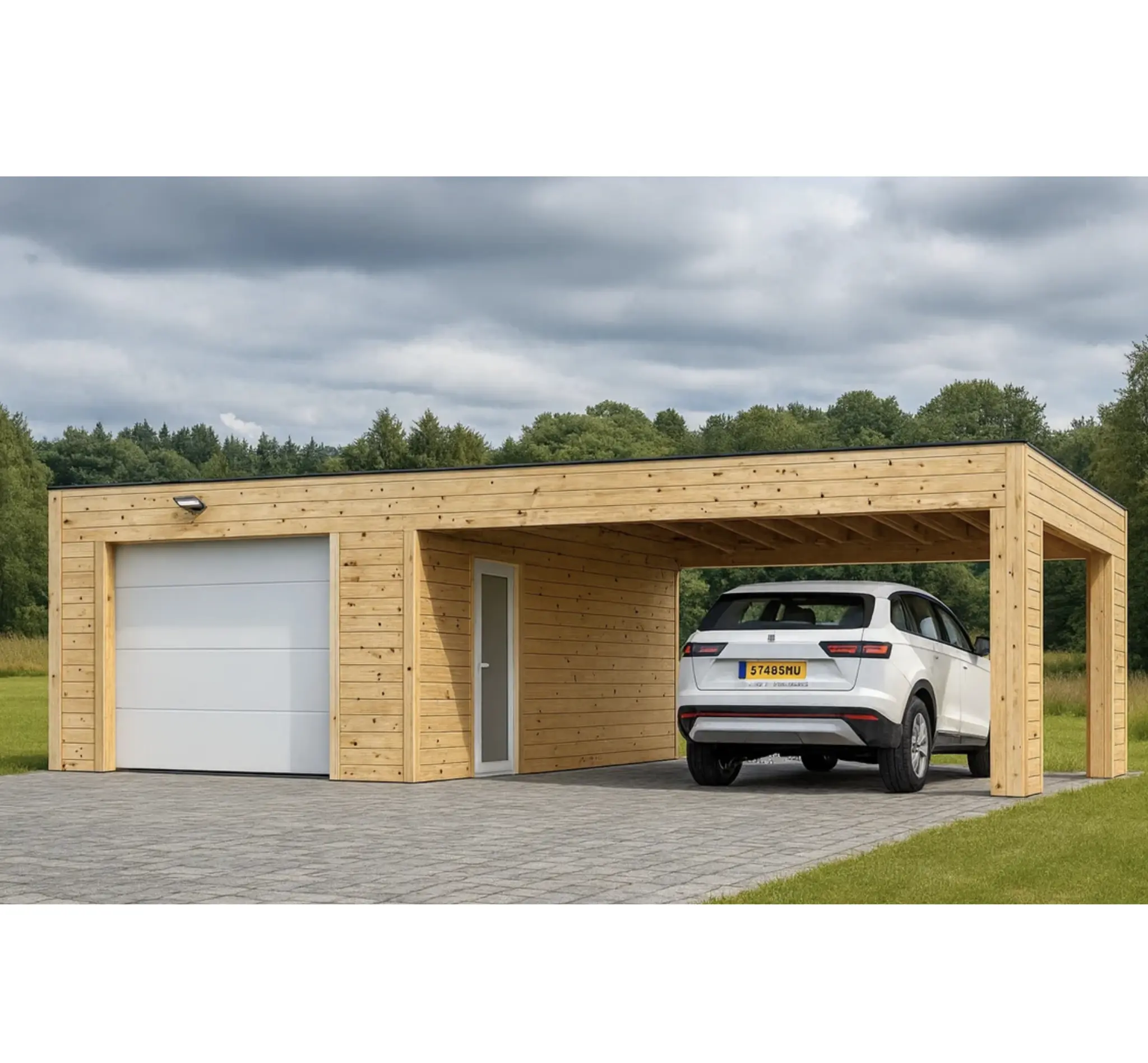 Modern insulated garage with 36 m² carport. Premium Nordic wood, 44 mm + 100 mm insulated walls, customizable doors and roofing. Ideal for homes & projects.