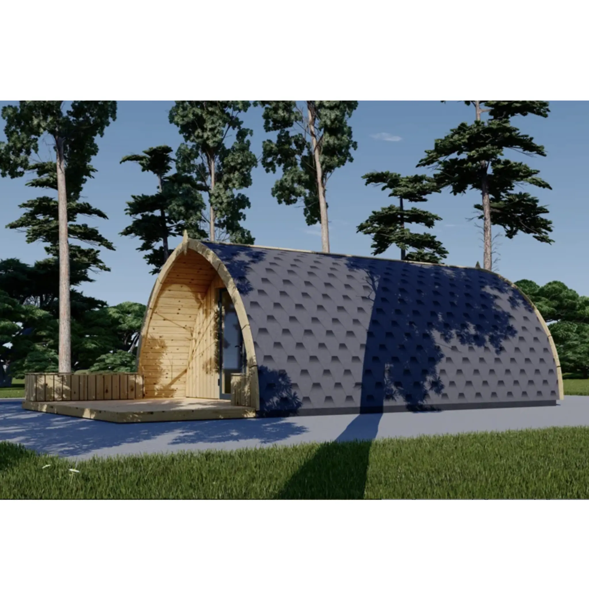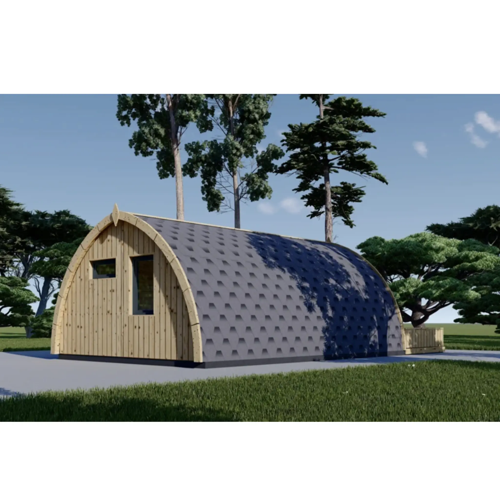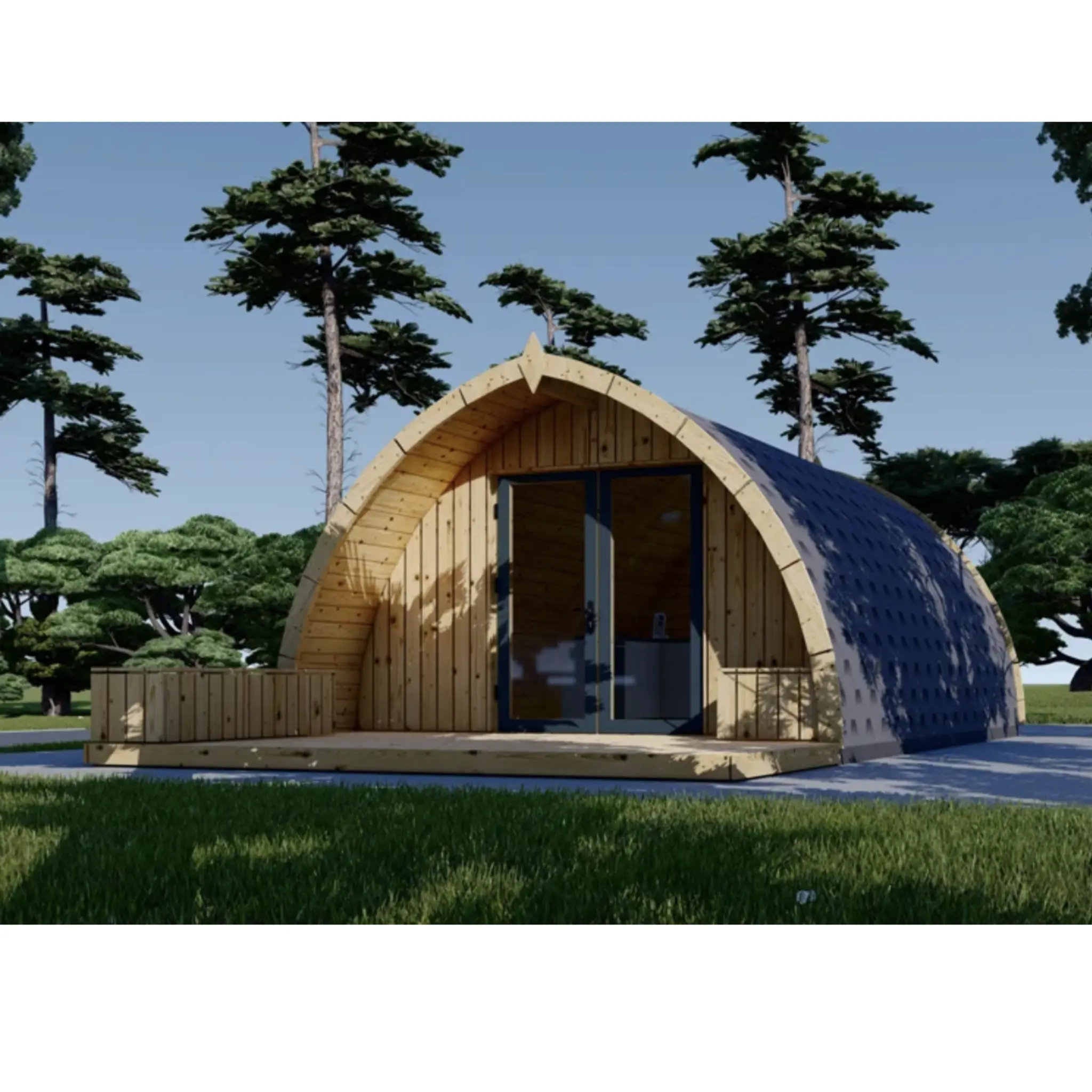 The BRETA cabin is an affordable, functional, and charming camping pod designed to enhance any outdoor experience. Its layout features a spacious communal area that can double as a kitchen and living room, along with a separate bathroom for added privacy. The compact terrace provides the perfect spot to relax and enjoy the outdoors. With its distinctive rounded design and double doors, the BRETA cabin blends traditional charm with a warm, inviting aesthetic.