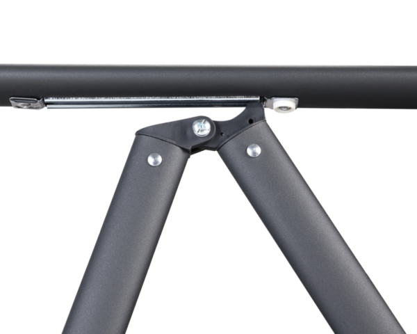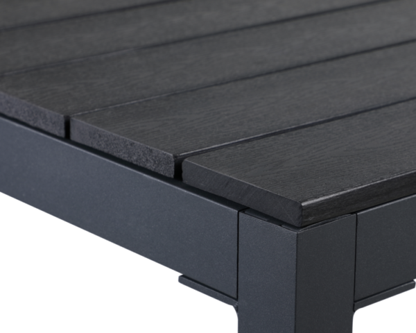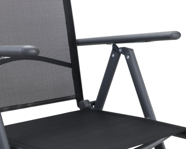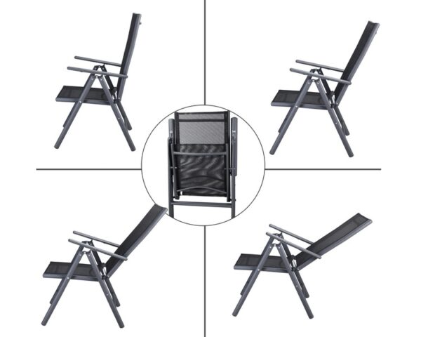 The backrest of the chair can be adjusted in four positions to find a more comfortable position. The seat and back of the chair are made of durable black textile material. The chair is foldable, which makes it easier to store. The furniture is weatherproof.