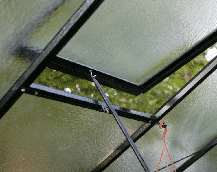 ACD greenhouse with a strong black aluminum frame and tempered safety glass. The roof is made of patterned frosted glass that effectively diffuses direct sunlight.