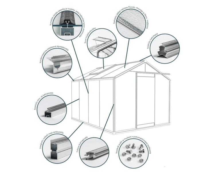 The walls of ACD’s plant and garden rooms are made of 4 mm tempered safety glass. It withstands impacts, bending, and temperature variations much more than ordinary glass and requires a strong, sharp, spike-like impact to break. Safety glass is many times stronger than regular greenhouse glass, and if damaged, it shatters into small fragments that do not cause lacerations. The aluminum frame profiles are solidly built, and in load-bearing places, they are additionally encased. Durable bolts and nuts are made of stainless steel, and rubber strips on top of the glass protect from rain and wind. An integrated base makes the frame really robust and anchors the room well to the ground. Therefore, ACD is a safe option, especially if you are planning a living space in your garden!