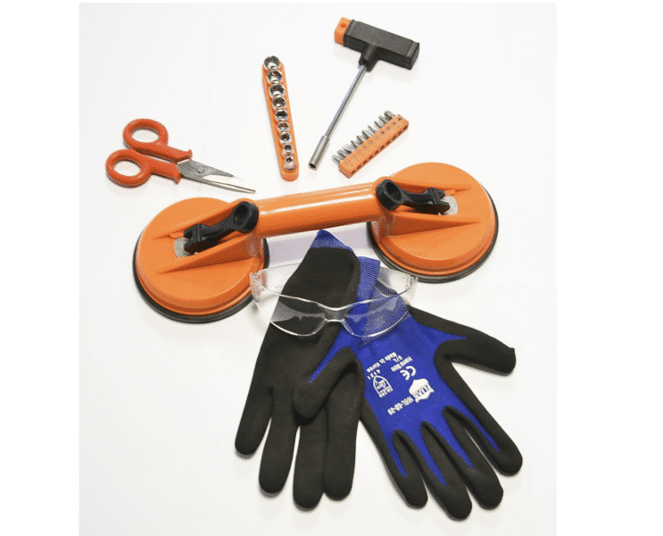 Includes glass suction cup lifters, gloves, safety glasses, socket set + star heads, and scissors.