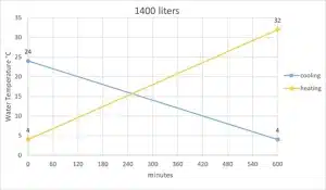 Chart showing cooling and heating of 1400 L ice bath water by the device