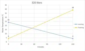 Chart showing cooling and heating of 320 L ice bath water by the device