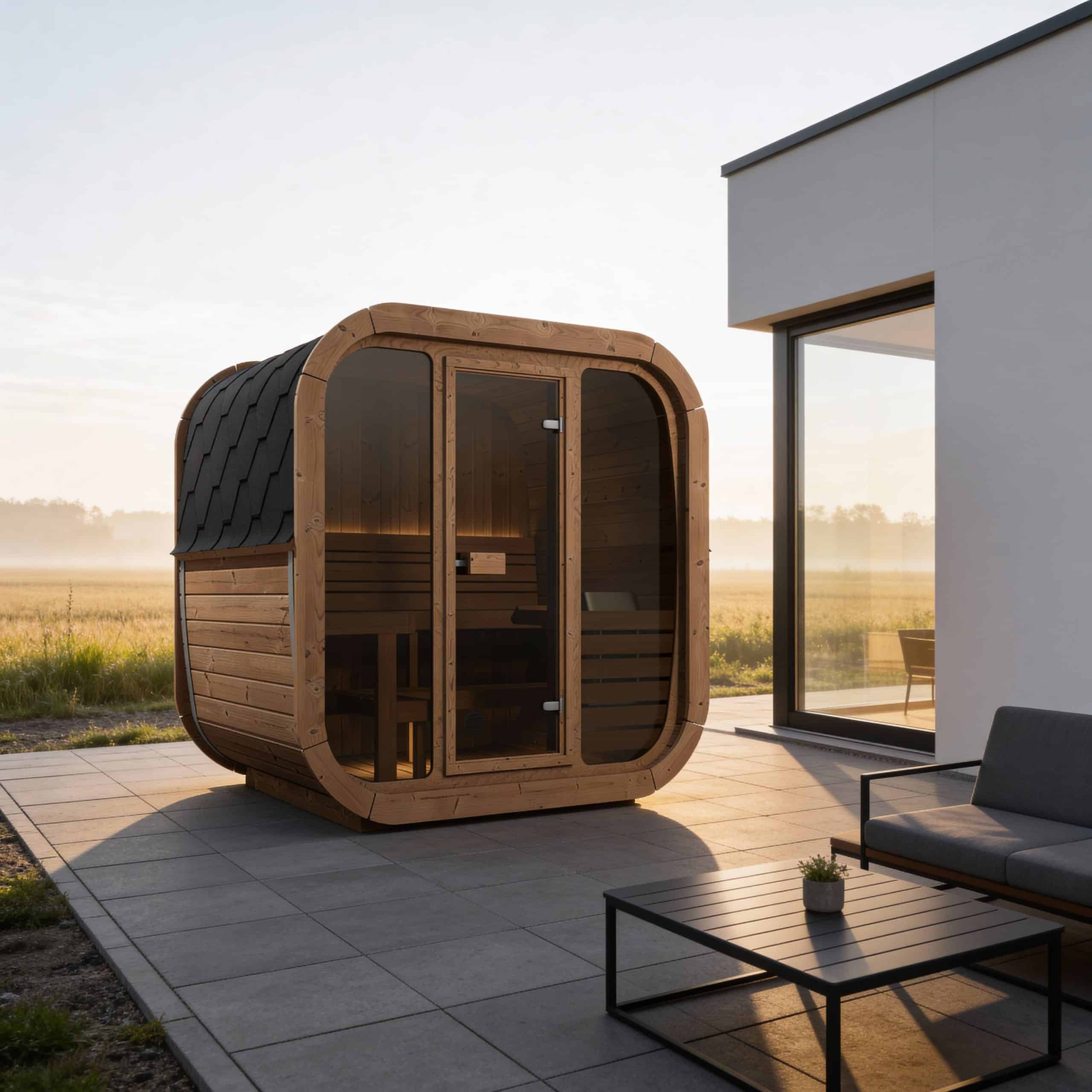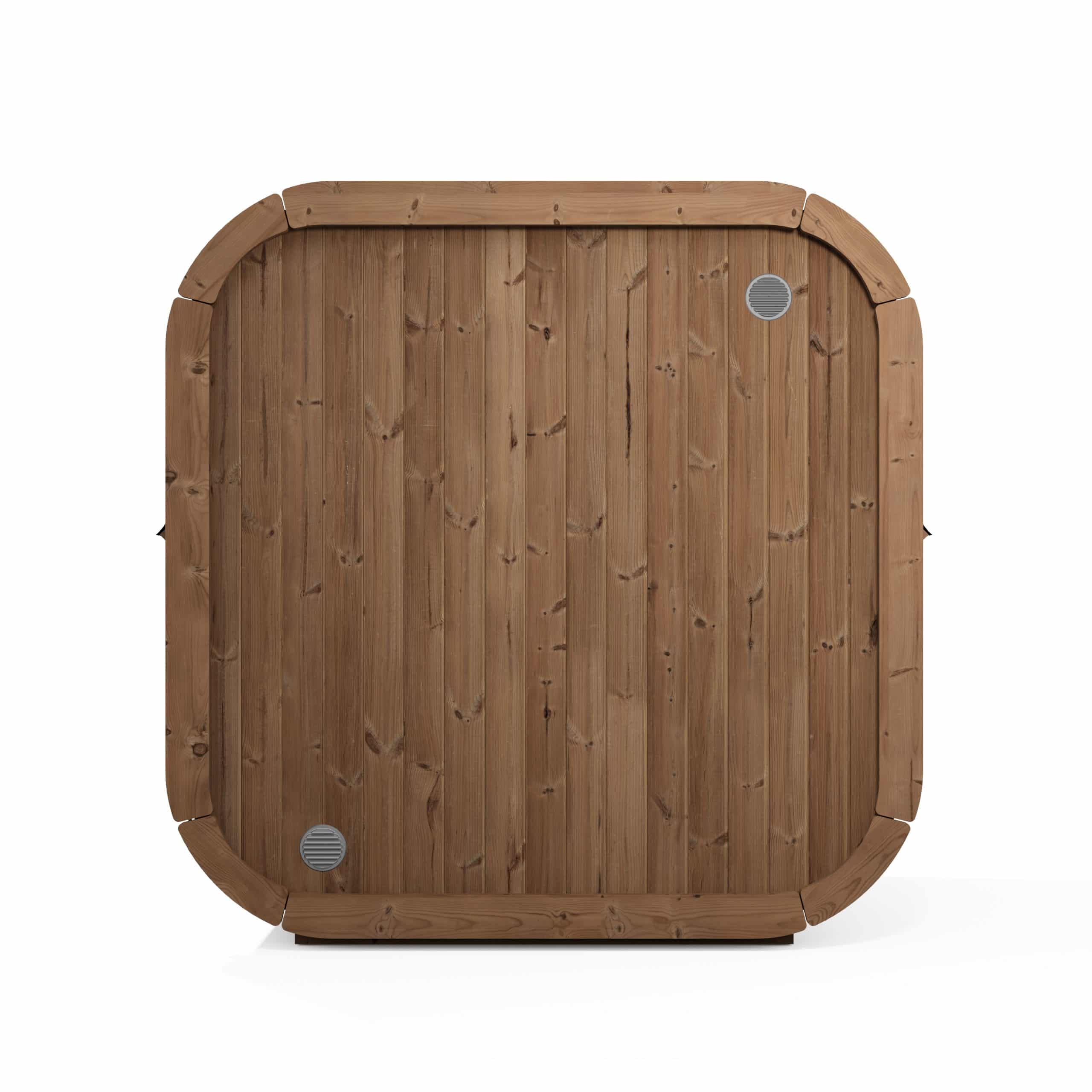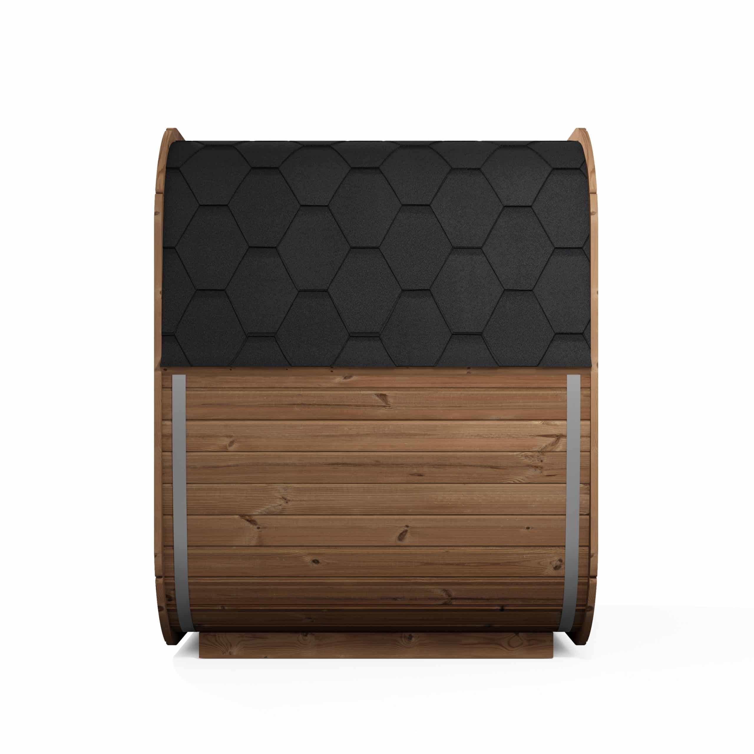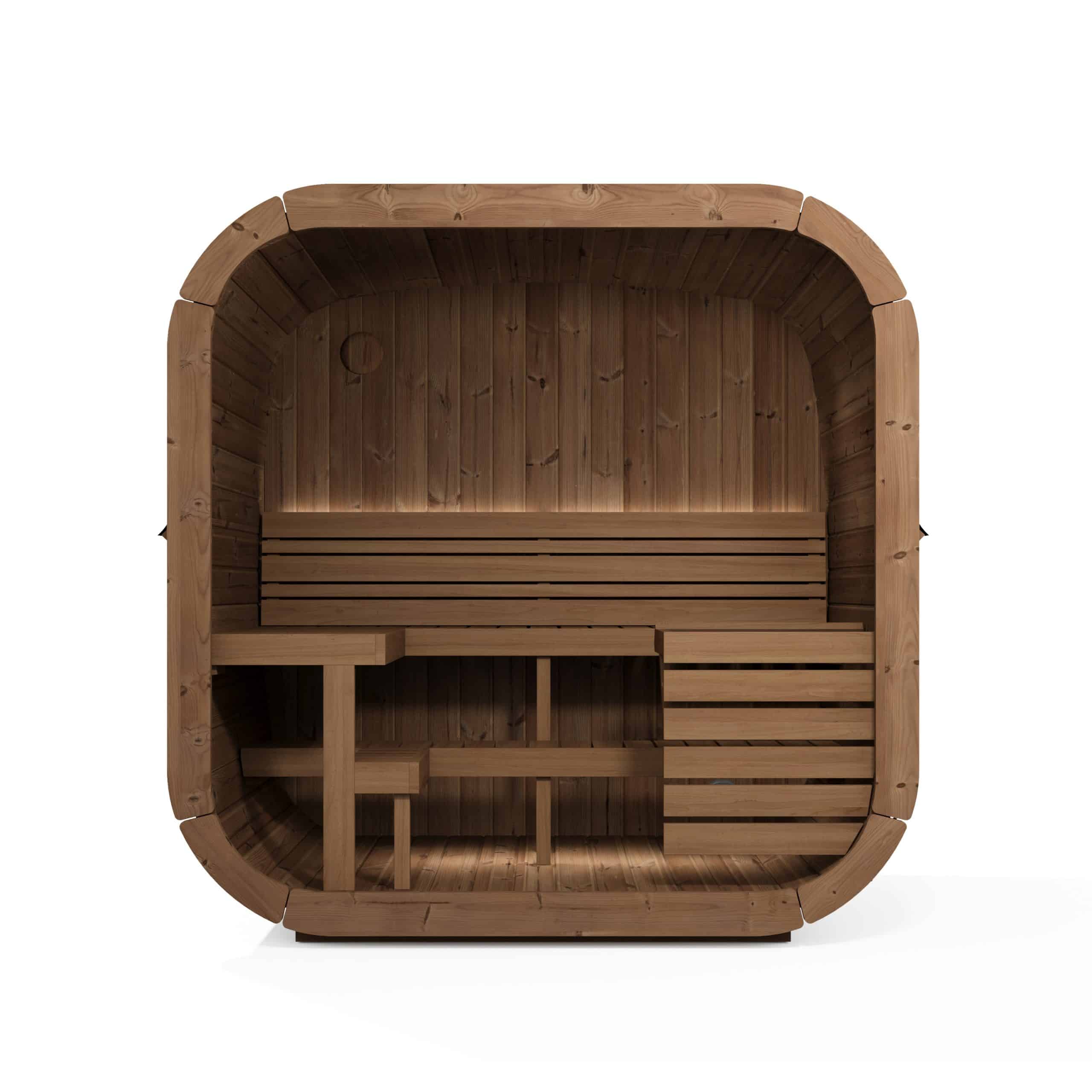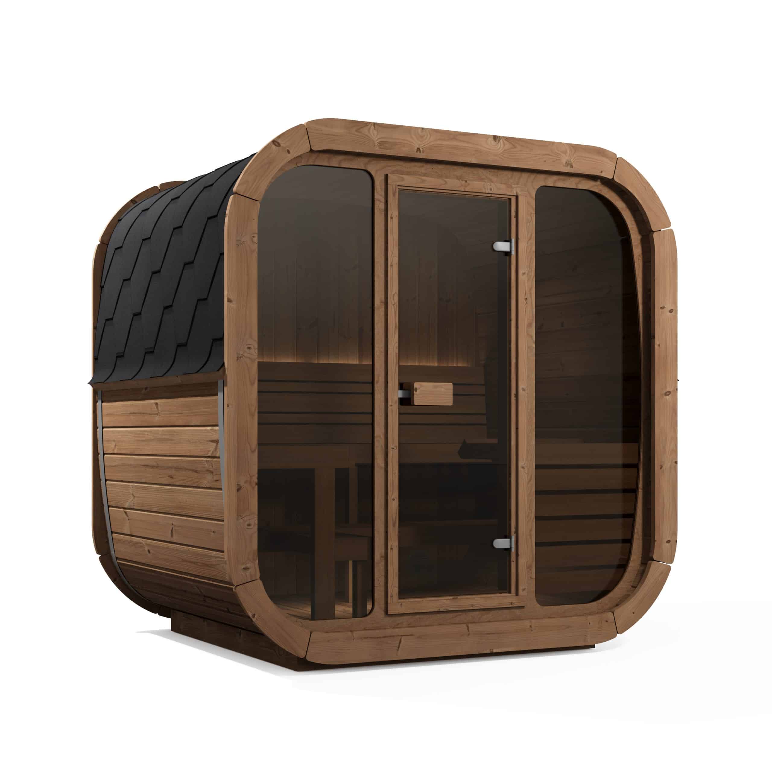 Cube-like design fits well to even modern gardens of today. This new design gives a better sauna experience as it has more room behind the back than a standard barrel has. Higher 2 level benches give a higher sitting point therefore heat distribution is more concentrated to sauna user.