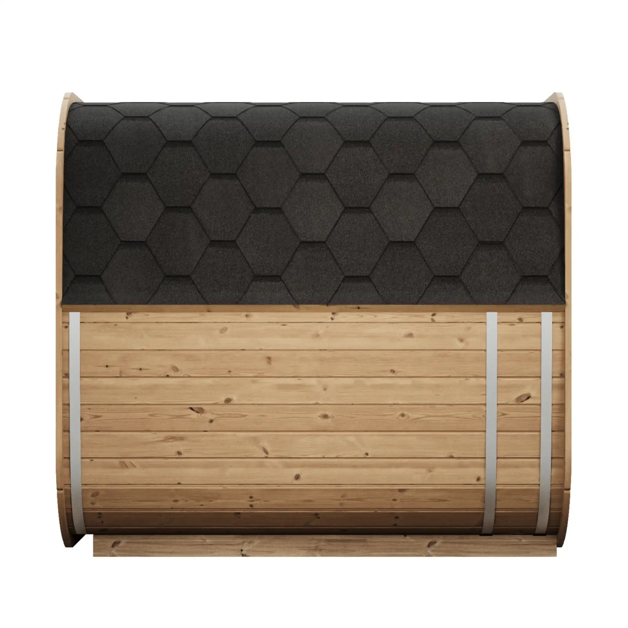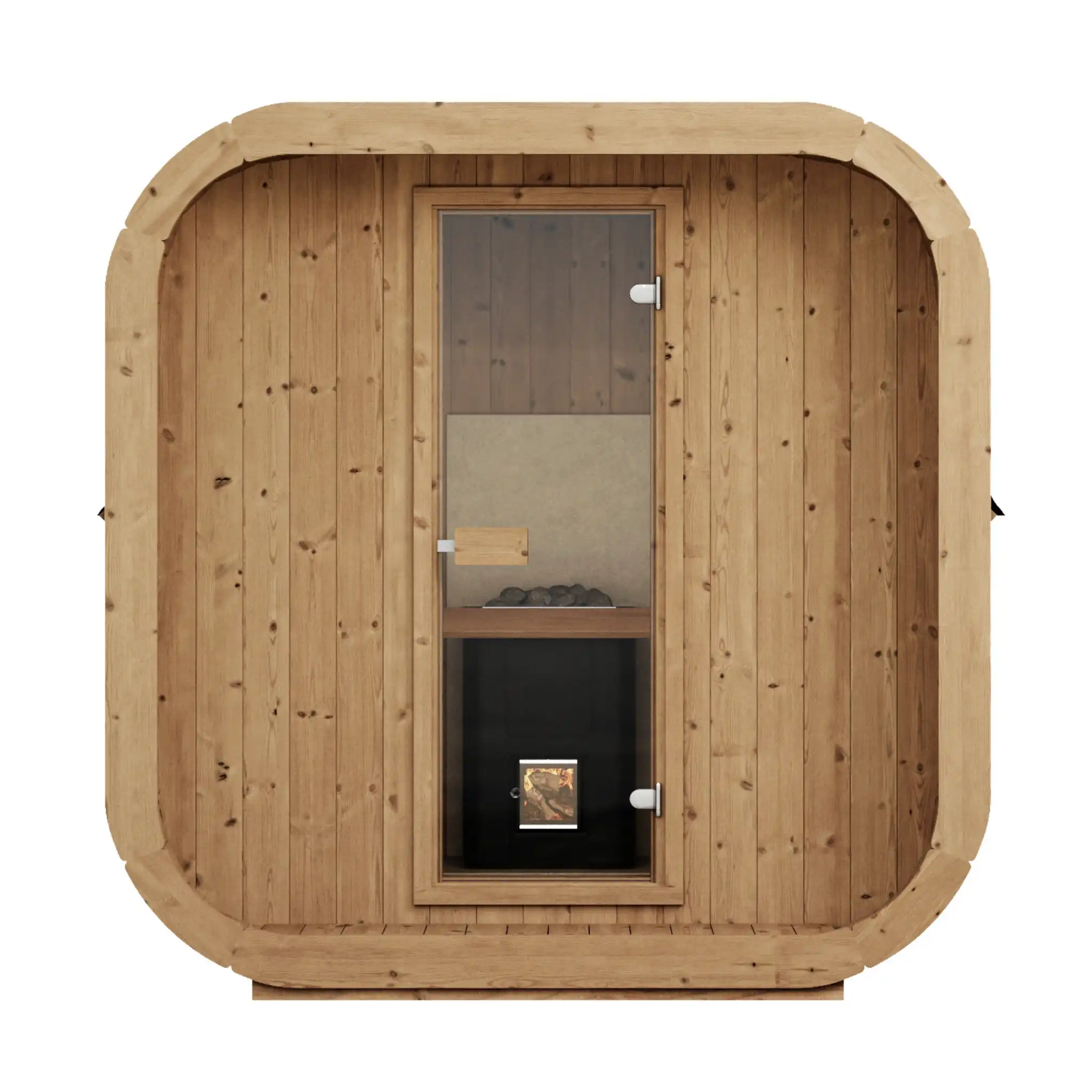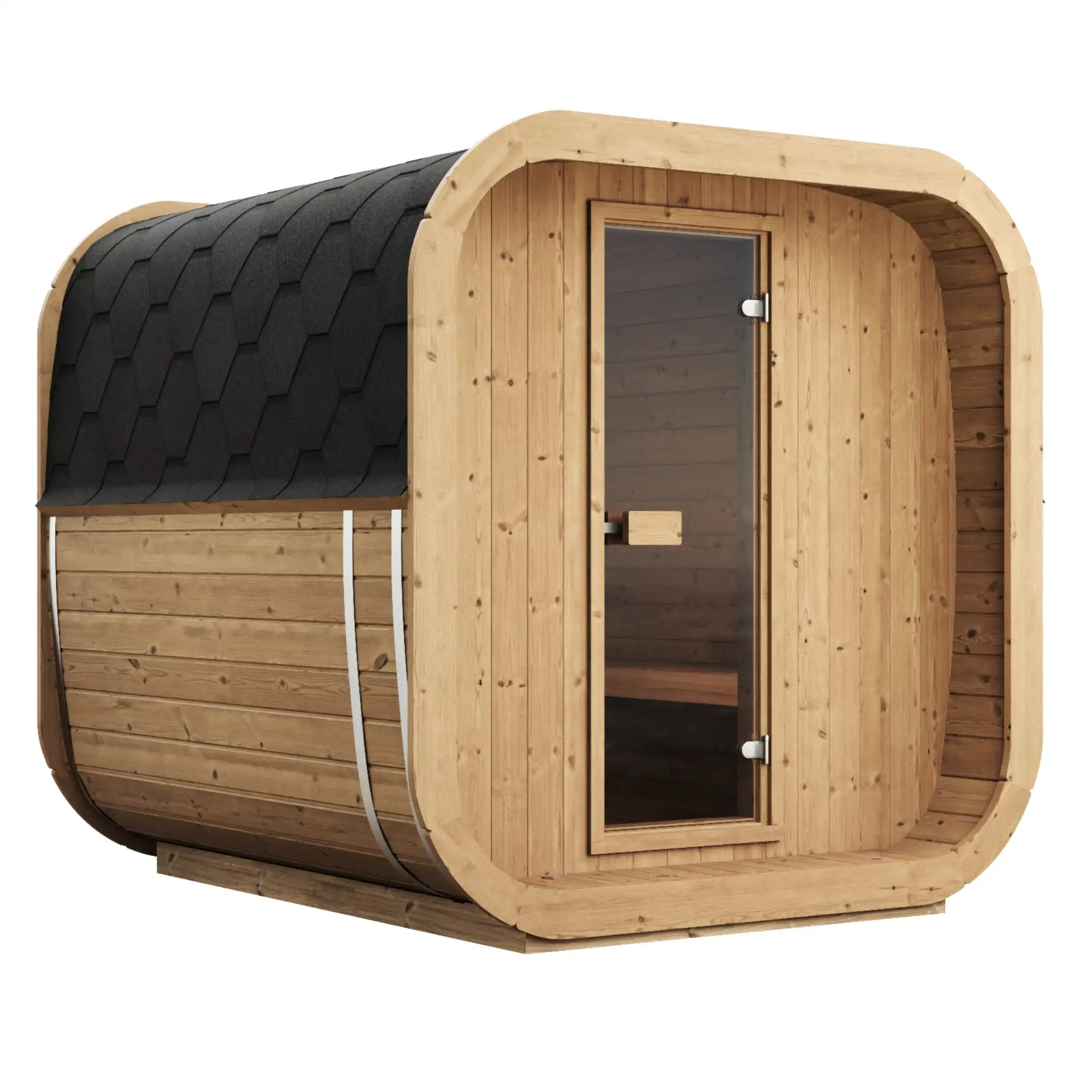 Cube-like design fits well to even modern gardens of today. This new design gives a better sauna experience as it has more room behind the back than a standard barrel has. Higher 2 level benches give a higher sitting point therefore heat distribution is more concentrated to sauna user.