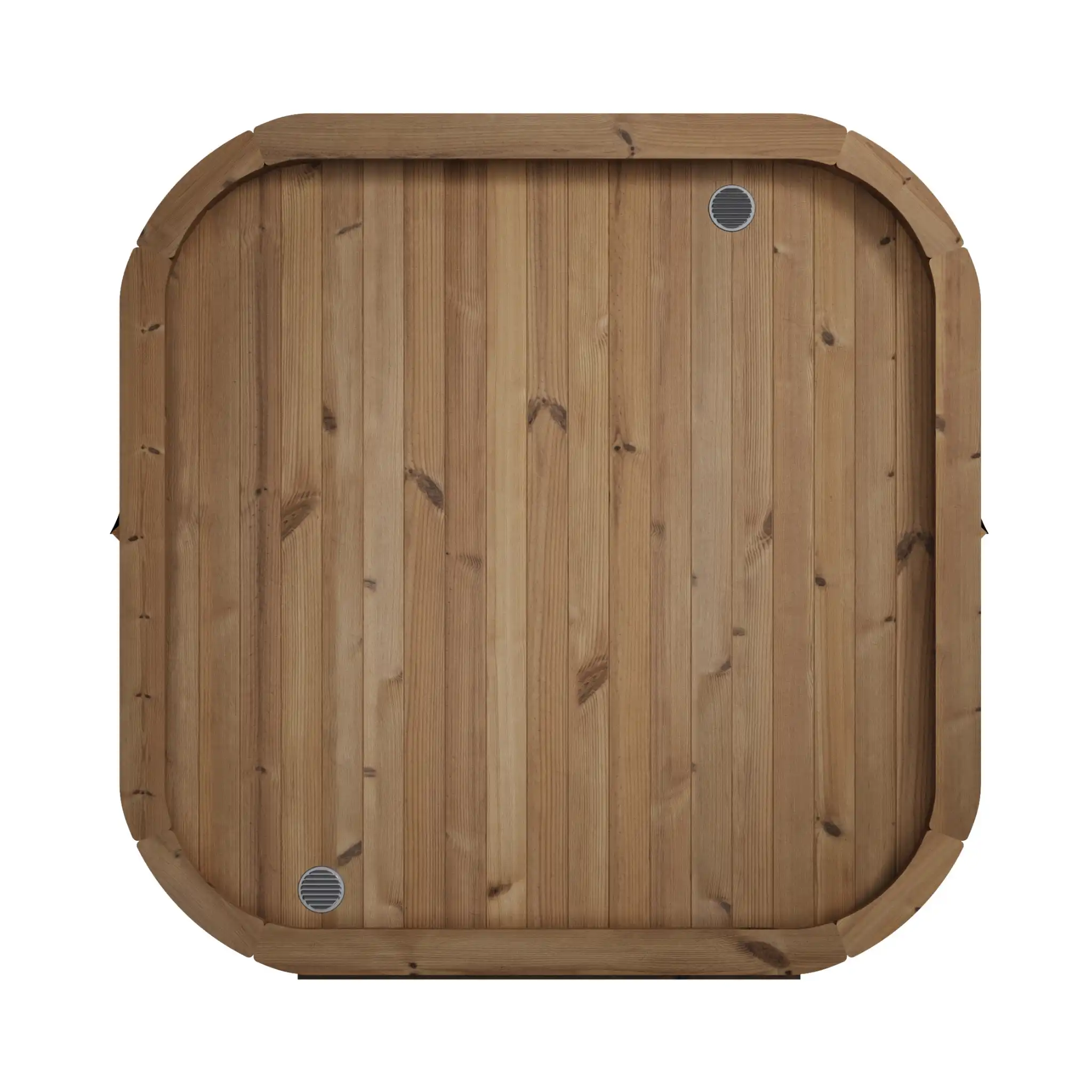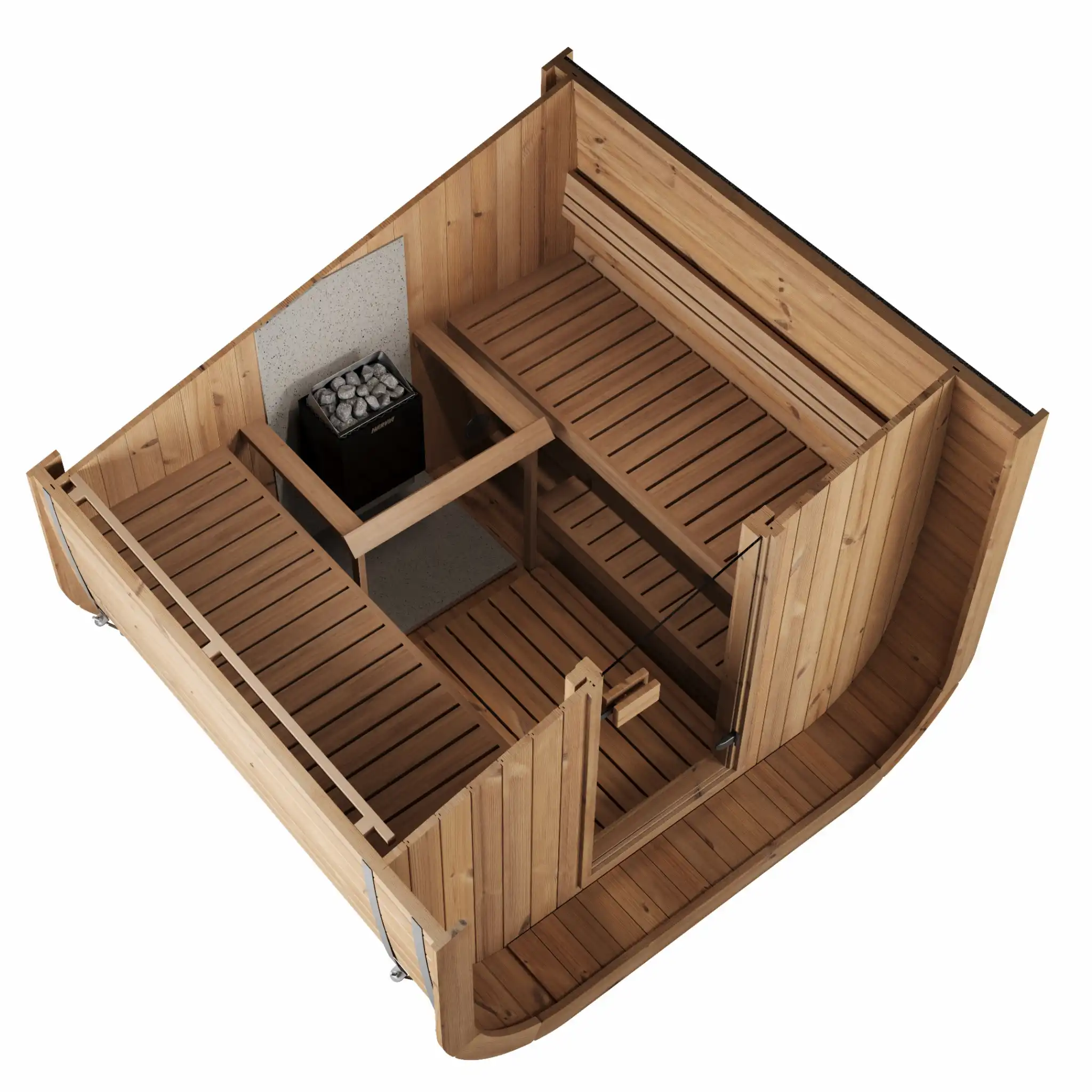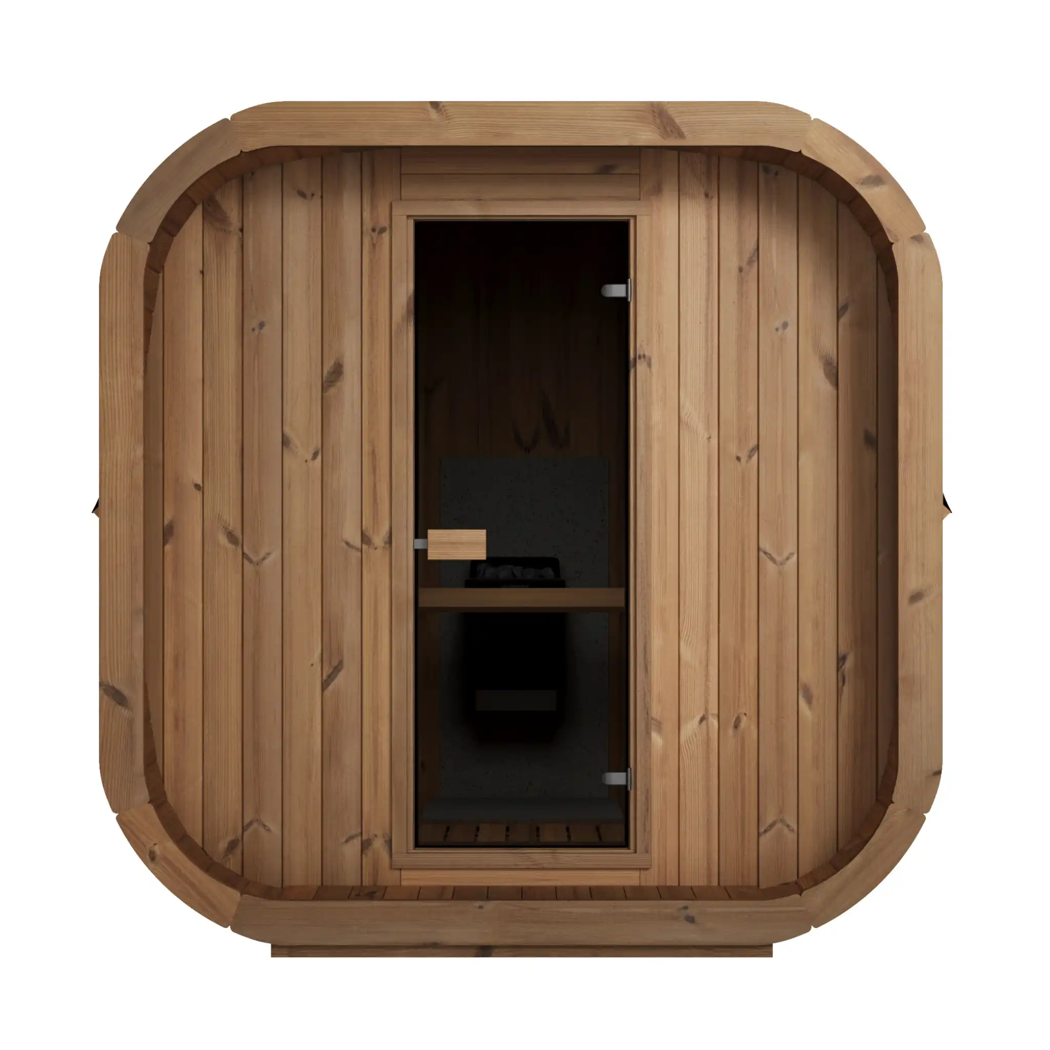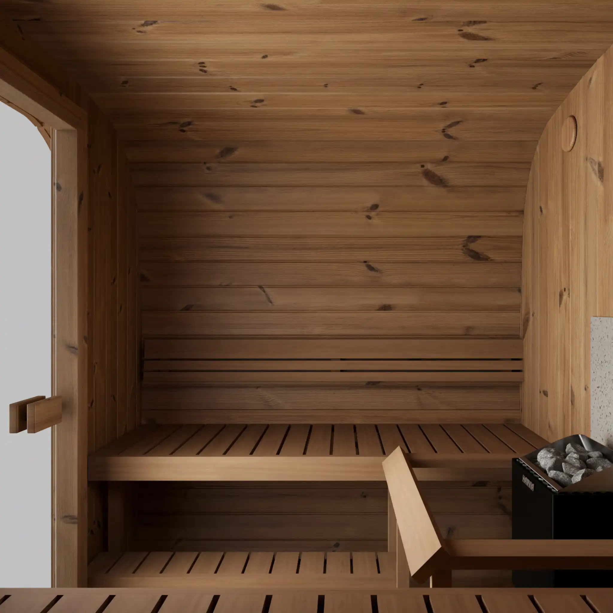 Cube-like design fits well to even modern gardens of today. This new design gives a better sauna experience as it has more room behind the back than a standard barrel has. Higher 2 level benches give a higher sitting point therefore heat distribution is more concentrated to sauna user.