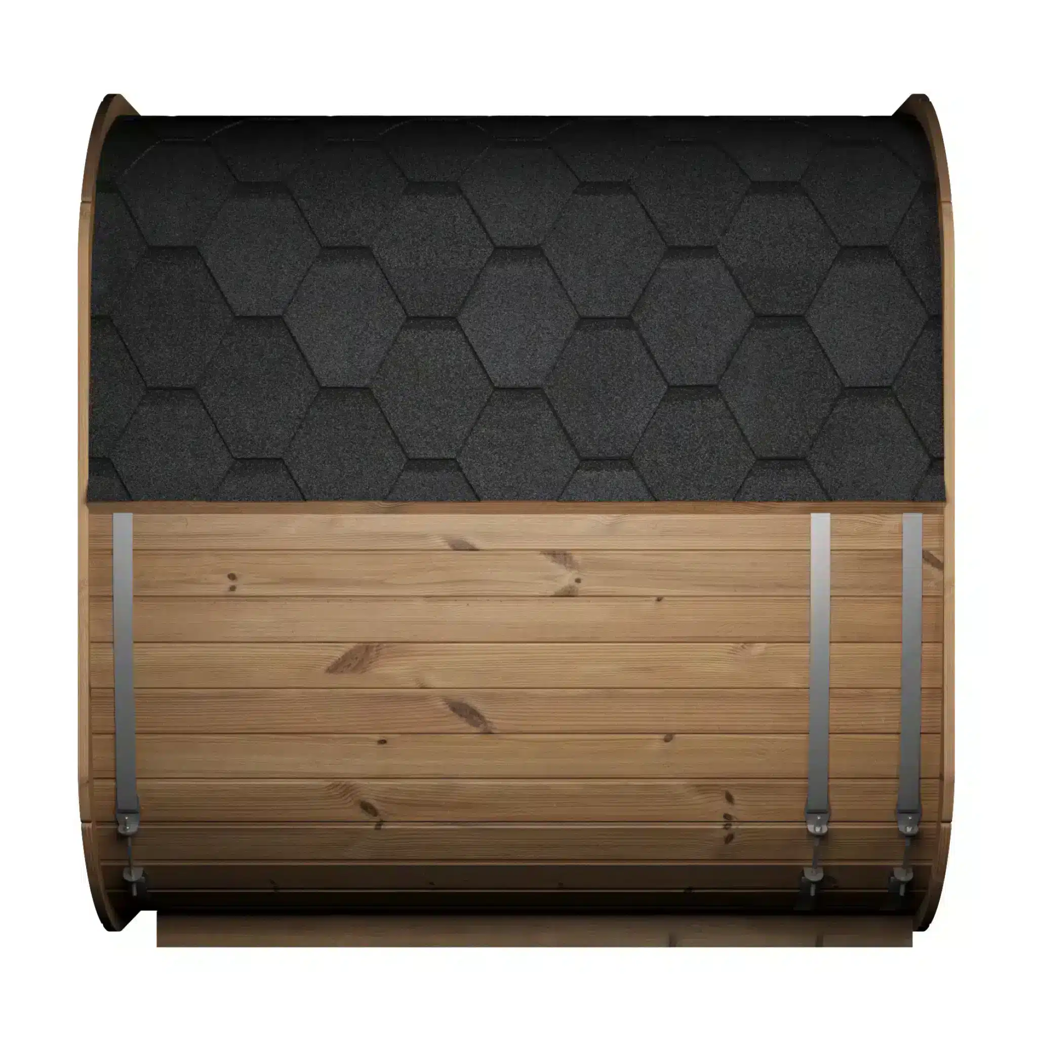 During the thermowood treatment, the wood is heated to temperatures between 180 and 230° Celsius in the absence of oxygen. The ability of the wood to absorb water is thereby greatly reduced and wood-degrading fungi and bacteria lose their food source. This increases the durability of the wood. All wooden parts of the barrel sauna (except door frames, window frames, roof panels and foundation beams) are made of Nordic thermowood.