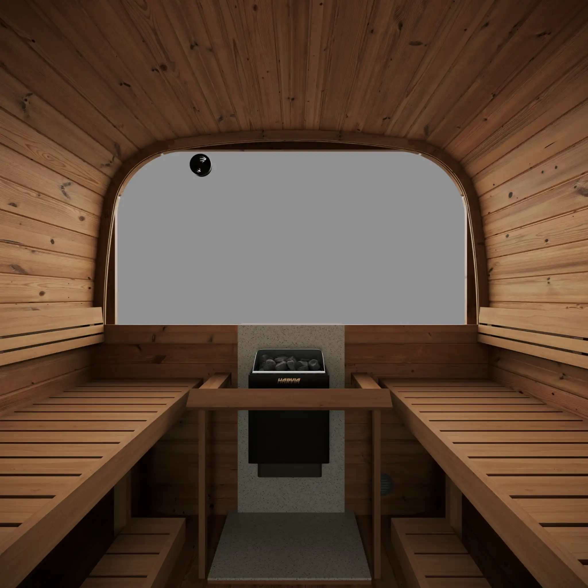 Due to the great 2-room design with an extra changing/relaxing room you can always take quick rests from sauna to chat with your loved ones. This extra room also helps to preserve heat loss in the sauna room and this model can be used with electric and wood burning heaters of client choice.