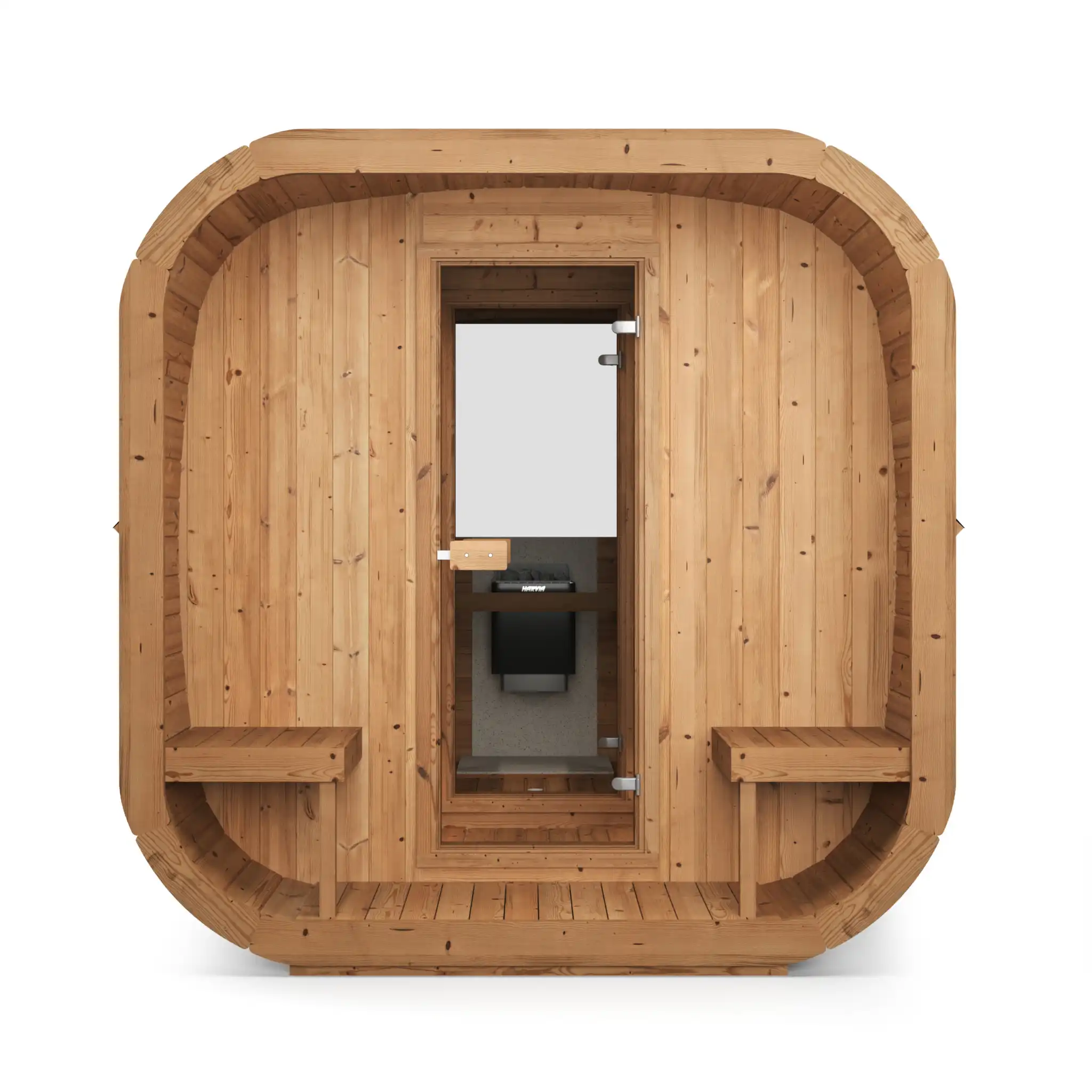 Cube-like design fits well to even modern gardens of today. This new design gives a better sauna experience as it has more room behind the back than a standard barrel has. Still easily assembled and movable like a barrel sauna.