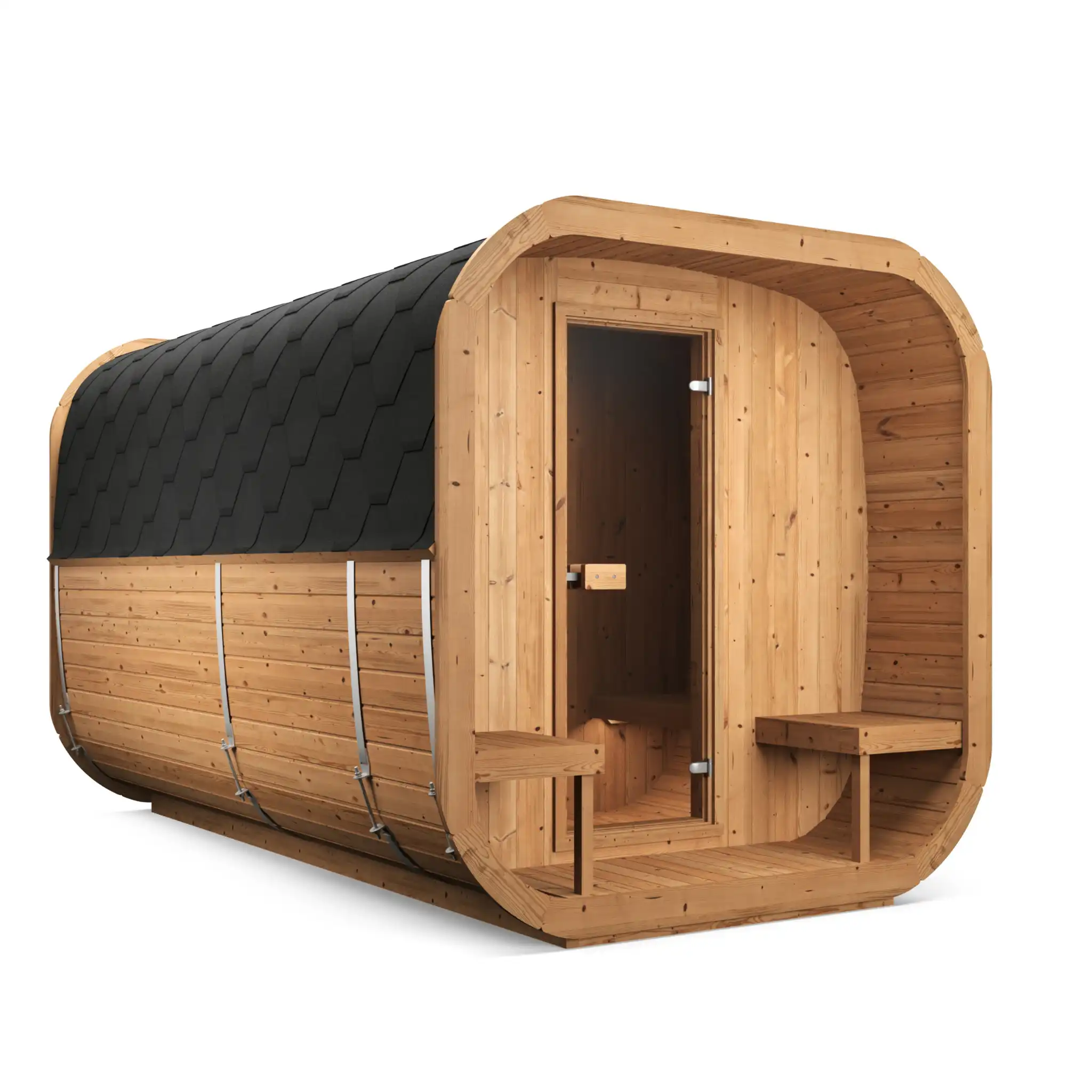 During the thermowood treatment, the wood is heated to temperatures between 180 and 230° Celsius in the absence of oxygen. The ability of the wood to absorb water is thereby greatly reduced and wood-degrading fungi and bacteria lose their food source. This increases the durability of the wood. All wooden parts of the barrel sauna (except door frames, window frames, roof panels and foundation beams) are made of Nordic thermowood.