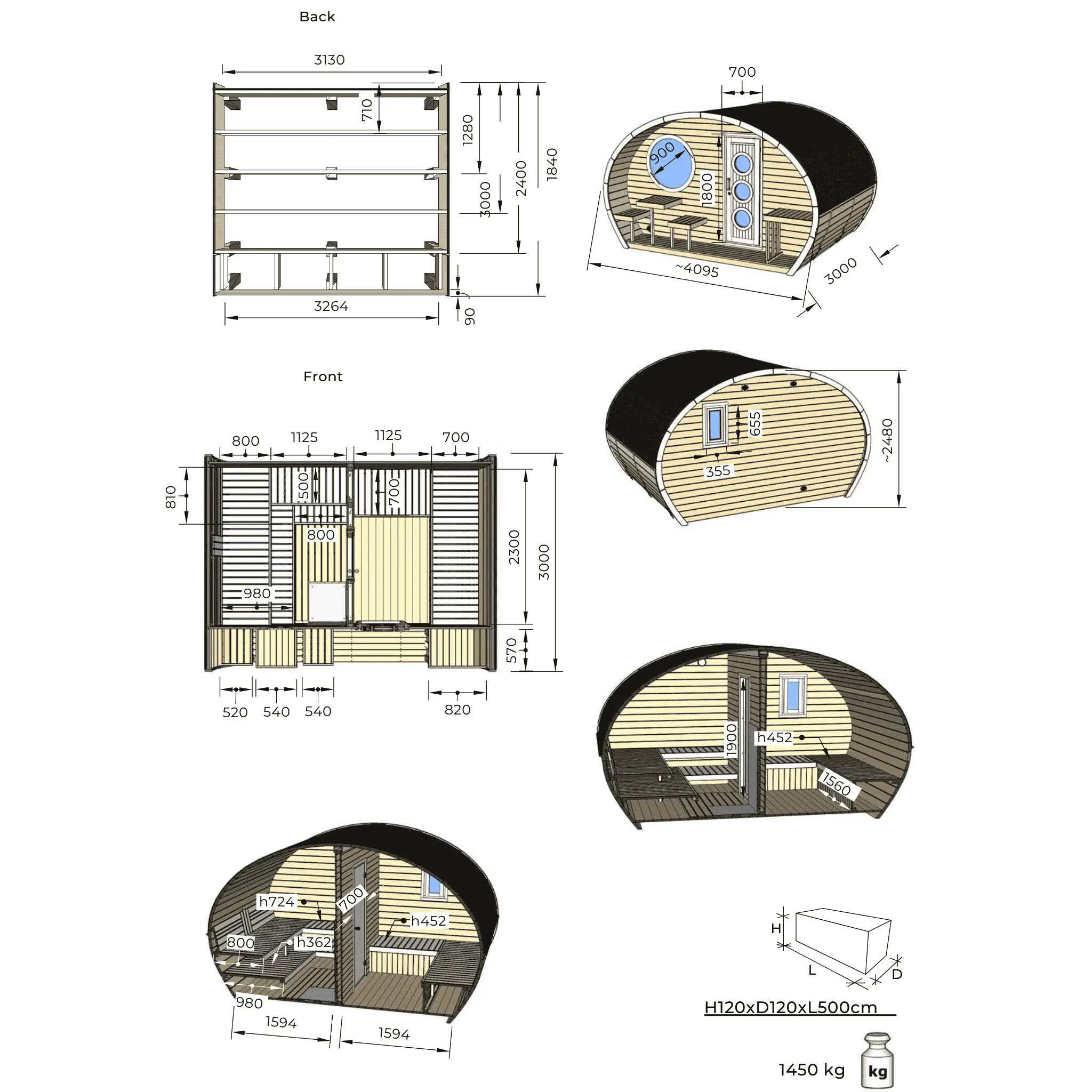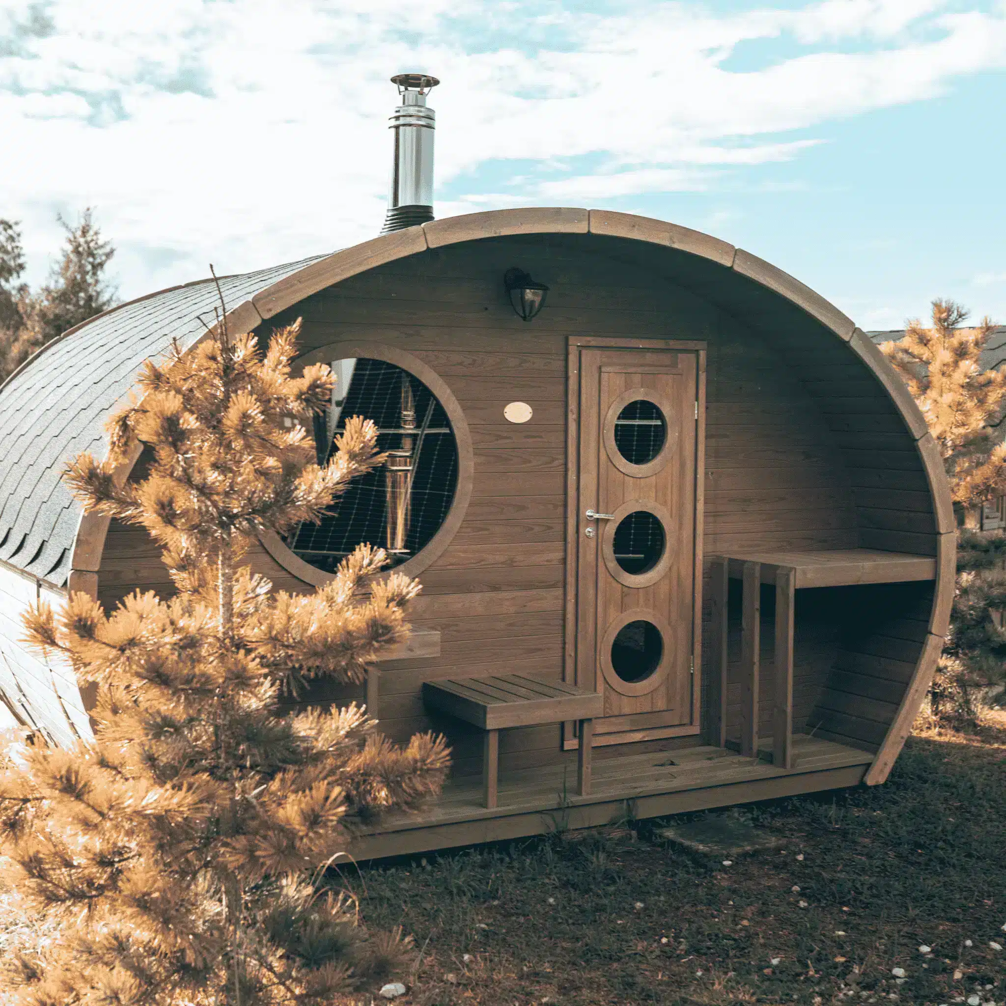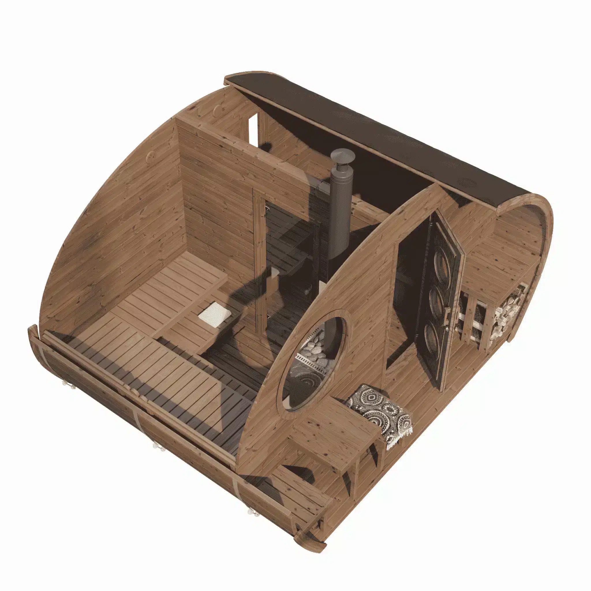 Its practical features include a cleverly integrated firewood storage area and a multi-level entrance space with an outdoor bench and table, allowing you to enjoy the sauna experience even outside the sauna. A large round panorama window brings abundant natural light into the sauna and offers beautiful views. Ilmarinen is built to last, crafted from premium weather-resistant materials that ensure longevity and durability.