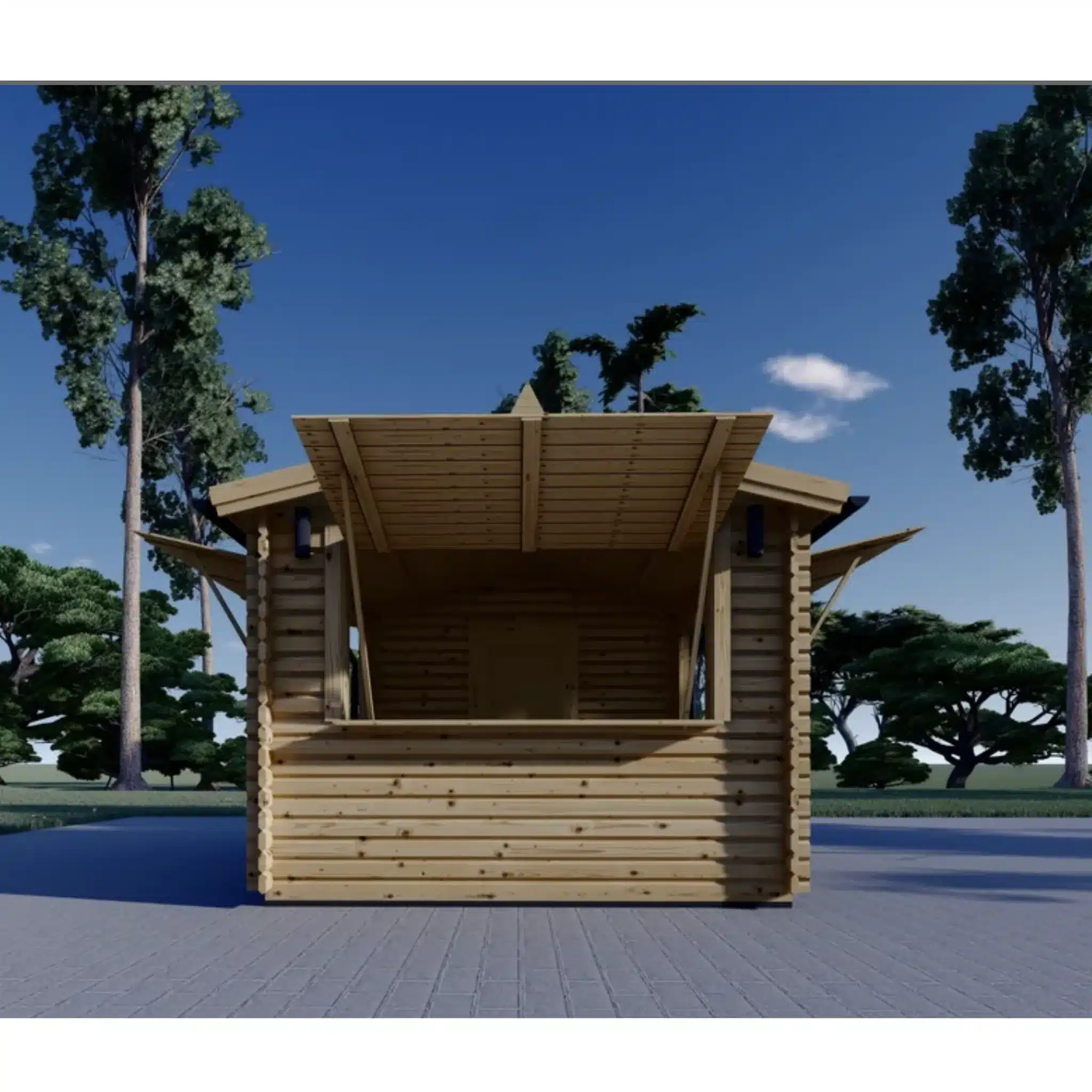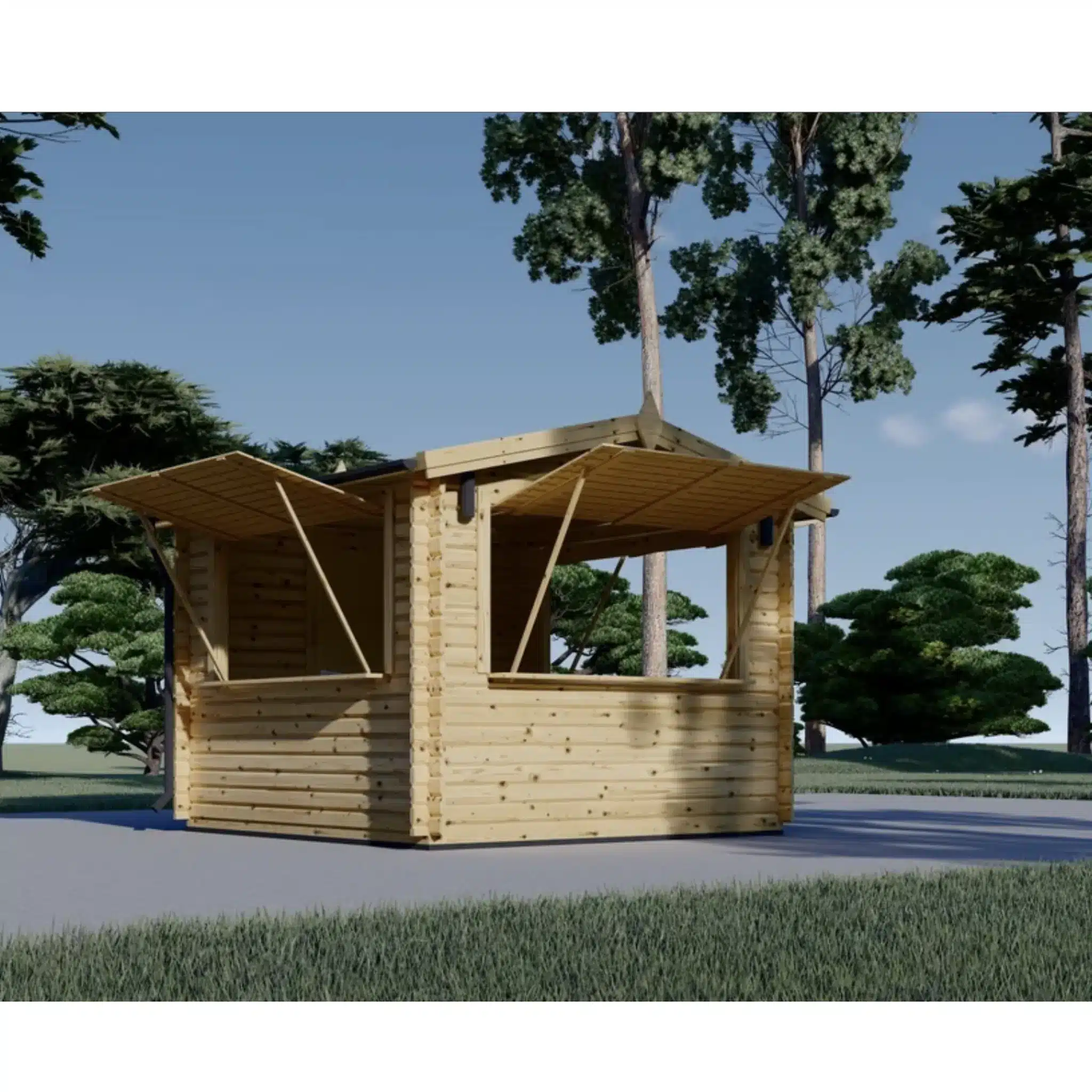 Spacious 16 m² wooden kiosk (4×4), 44 mm walls. Ideal for small businesses, events, and exhibitions. Features opening shutters, durable materials, and optional roof covering.