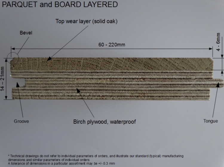 The wear layer has a thickness of about 3 mm to 6 mm and is made of oak wood which is characterized by high durability and timeless appearance. Our offer also includes layered ash boards and other wood types for individual customer’s orders. To reduce the penetration of moisture from the substrate and to provide more stability we used waterproof birch plywood as a bottom layer. For gluing these two layers, we use precisely cut material strictly according to technological standards, using the best adhesives available on the market.