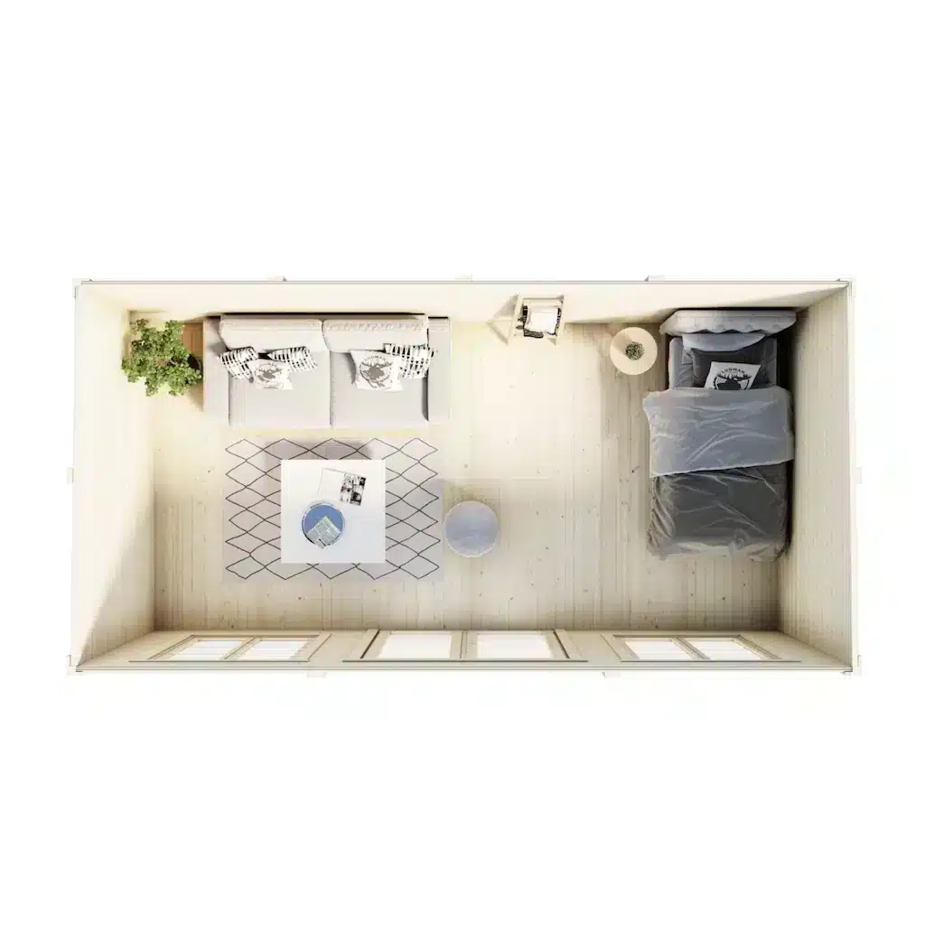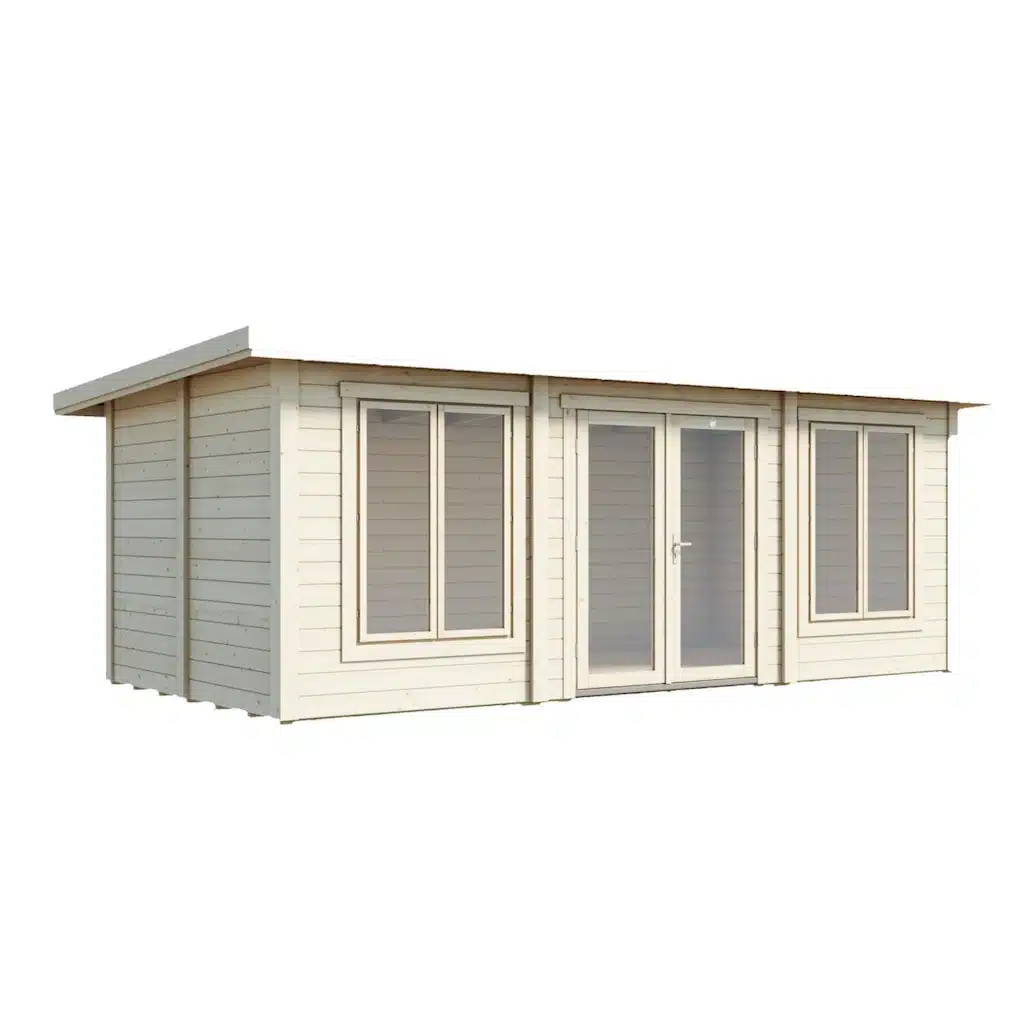The 21 mm thick floorboards and 44 mm thick double tongue-and-groove wall logs provide exceptional durability. This model features a “city corner” design, meaning the wall logs are attached to corner posts. Doors and windows include CE-approved insulated safety glass.