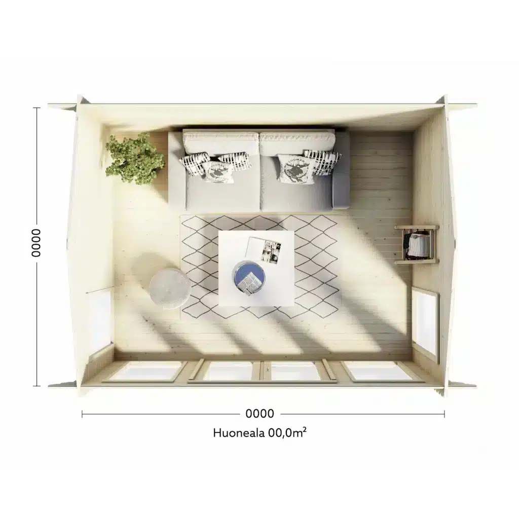 The Lillevilla Olos summer kitchen is a modern addition to your backyard. This nearly 12-square-meter glazed summer kitchen is made from 34 mm thick lightweight logs. The exterior dimensions of the summer kitchen are 3.9 x 3 meters. The ridge height is over 2.6 meters, and the sidewall height is 2.03 meters. This model features traditional log corner joints, and its large windows provide stunning views of the surroundings. The windows and doors are fitted with tempered safety glass.