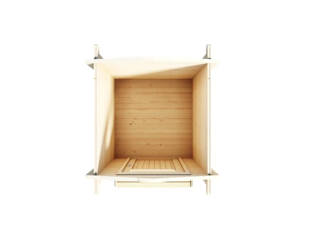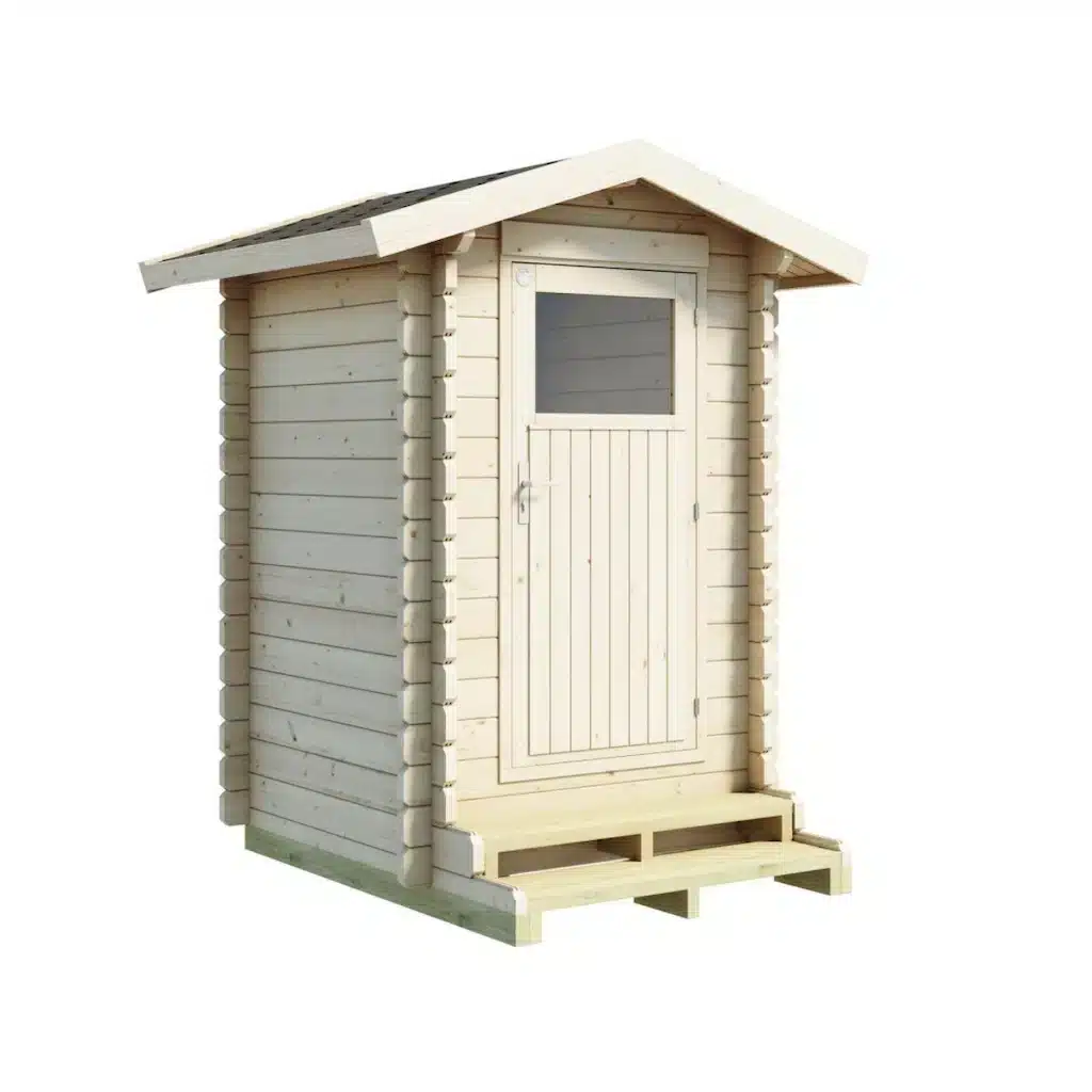 Lillevilla Ratamo is made of 40 mm lightweight logs. Its base measures 140 x 140 cm, with a ridge height of 260 cm and a sidewall height of 223 cm. The outdoor toilet is designed for use with a separately purchased toilet container, which is available in various models. Lillevilla Ratamo includes a solid floor and supports both above-floor and in-floor toilet containers. The required floor opening for the container is made during installation.