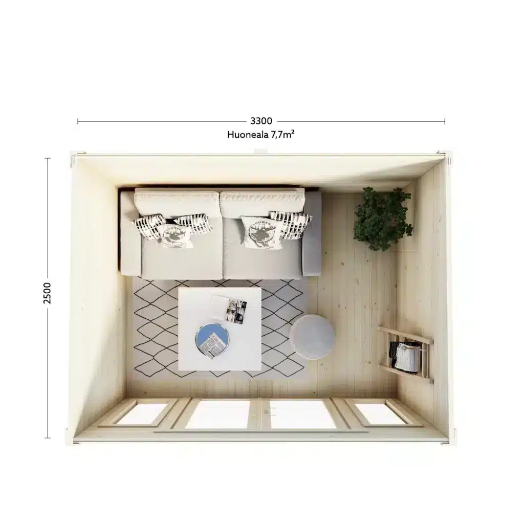 The floor area of this model is just over 8.25 square meters, with a width of 3.3 meters and a depth of 2.5 meters. The ridge height of the guesthouse is 245 cm. The roof area is 10.7 square meters.