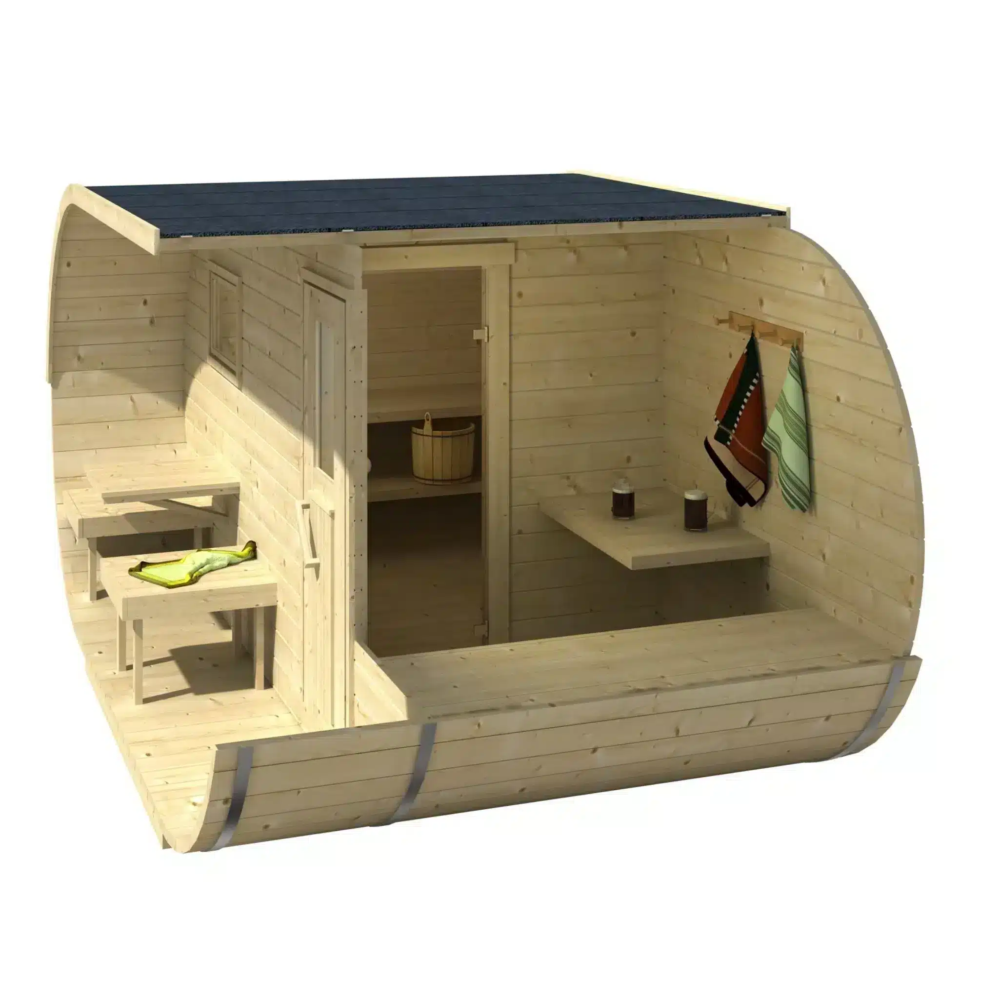The Lumikki sauna combines a stylish design with practical features, offering a spacious sauna room, a separate changing area, and a cozy terrace. Built from durable Nordic spruce, this sauna is the perfect addition to your backyard or garden, providing relaxation and a connection to nature.