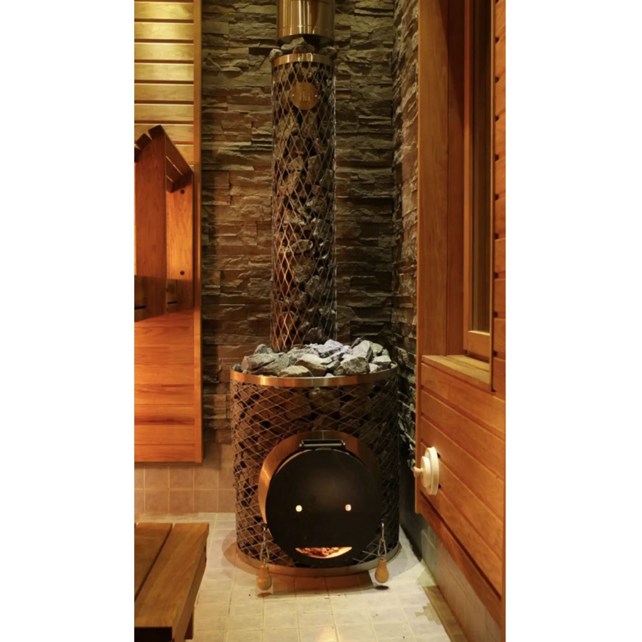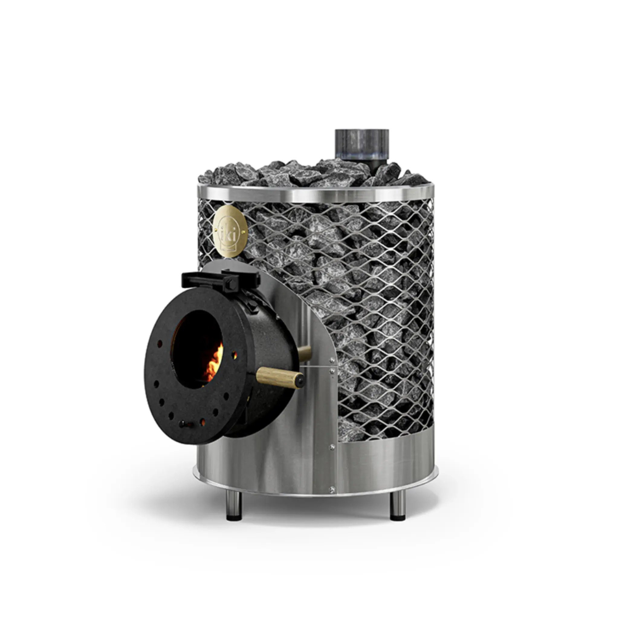 Mini IKI is the smallest model in the IKI wood-burning stove range, designed for saunas sized 5–12 cubic meters. Despite its compact size, it holds an impressive 120 kg of stones. The firebox is extended with a welded heat circulation pipe, which enables fast heating of the large stone mass. Mini IKI is a highly efficient heater for small saunas and ensures warmth even on the lower benches thanks to its substantial stone volume. Draft control is effortless with the adjustment knob on the door. The stove is delivered with a base, which is permanently bolted to the unit.