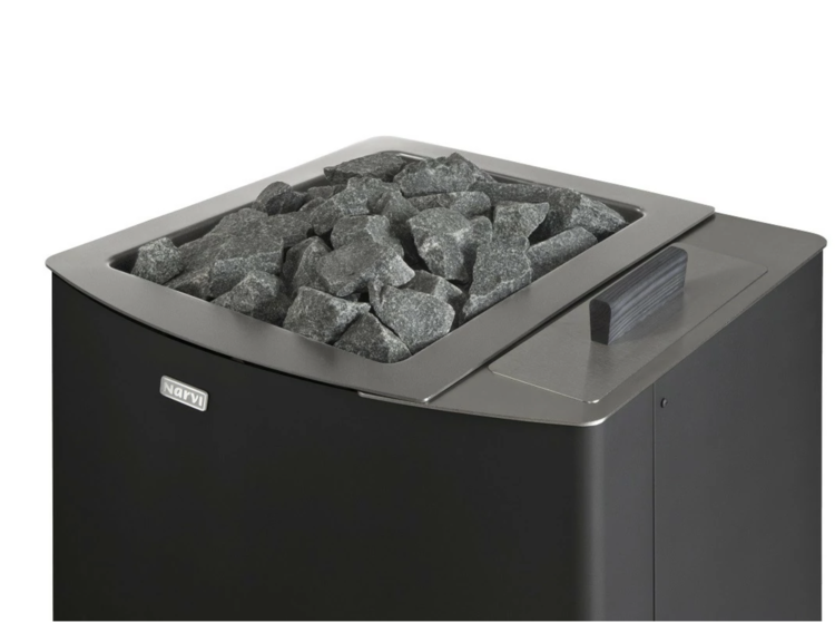 The Narvi NC stove emphasizes a minimalist and timeless design, making it easy to place in both traditional and modern saunas. The stove's casing is black, highlighted by a black cast iron glass door, a black ashtray front plate, and a steel frame surrounding the stone space. The firebox's structure represents a new design, making combustion more efficient and cleaner.