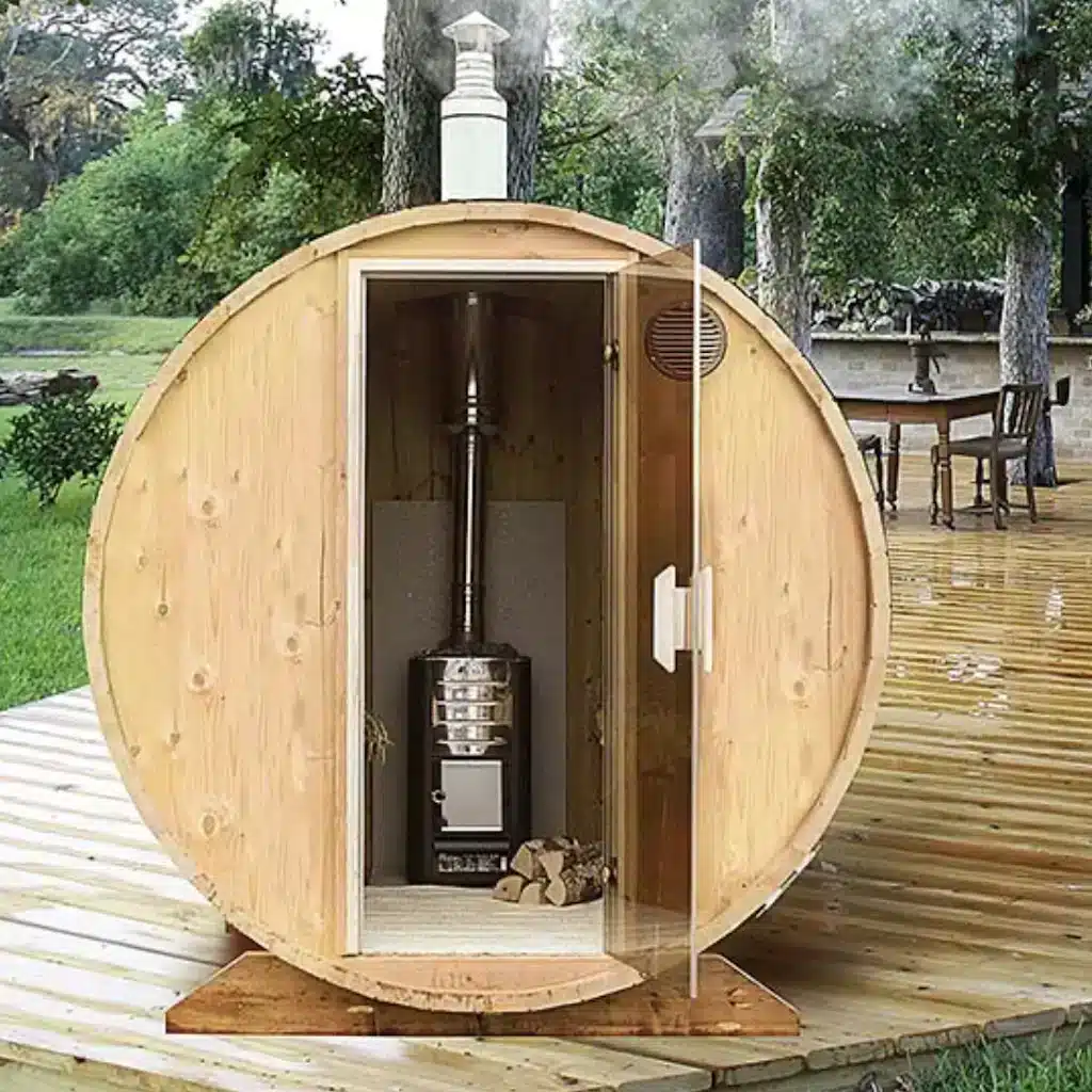 Compact Barrel Sauna having only a steam room perfectly suits a family of 4-5 members and a small site. This small outside sauna can be complemented with both a wood-burning stove and an electric heater. Barrel sauna is delivered in both assembled and non-assembled versions, also, it can be made from spruce or thermowood. You can improve this model using other useful accessories which you can find in the section Sauna accessories.