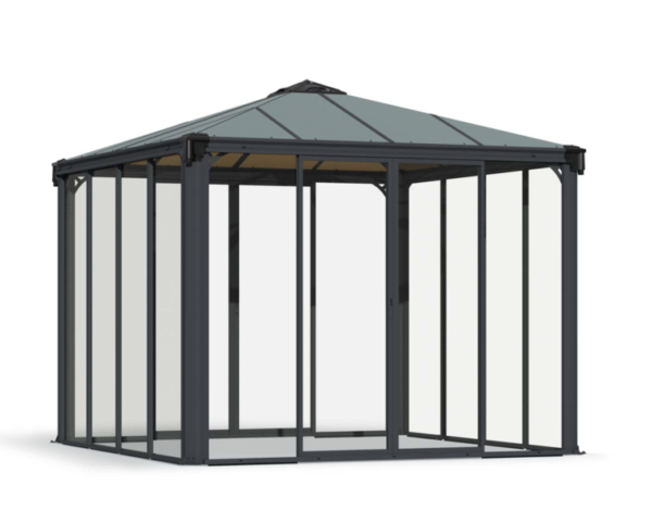 Relax in the stylish Palram-Canopia Ledro 3000 pavilion with doors. The Ledro gazebo has a weatherproof structure and is perfectly suited to various yard environments. The pavilion has a sturdy and reinforced structure with strong and corrosion-resistant anthracite gray powder-coated aluminum profiles and galvanized steel joints.