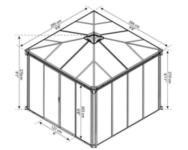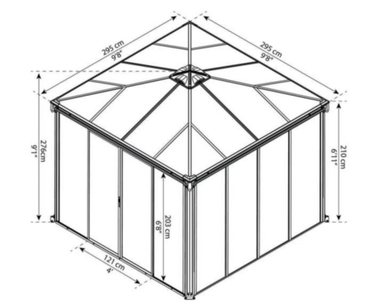 Two wide double sliding doors can be installed on any of the four sides. Two doorways improve ventilation and facilitate passage. The sliding doors can be locked with a key. Practically unbreakable, 100% UV-protected 6 mm cellular polycarbonate roof panels protect against harmful UV rays, hail and snow. The bronze tinted panels let natural light through on a cloudy day and provide enough shading on hot sunny days.