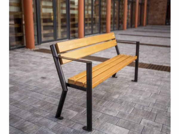 The strong wooden parts of the bench are attached to the galvanized steel structure, which has been treated with powder paint.