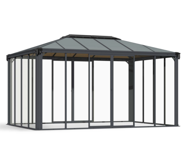 Relax in the stylish Palram-Canopia Ledro 4300 pavilion with doors. The Ledro gazebo has a weatherproof structure and is perfectly suited to various yard environments. The pavilion has a sturdy and reinforced structure with strong and corrosion-resistant anthracite gray powder-coated aluminum profiles and galvanized steel joints.