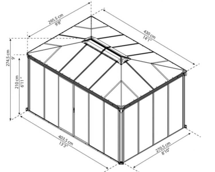 Two wide double sliding doors can be installed on any of the four sides. Two doorways improve ventilation and facilitate passage. The sliding doors can be locked with a key. Practically unbreakable, 100% UV-protected 6 mm cellular polycarbonate roof panels protect against harmful UV rays, hail and snow. The bronze tinted panels let natural light through on a cloudy day and provide enough shading on hot sunny days.