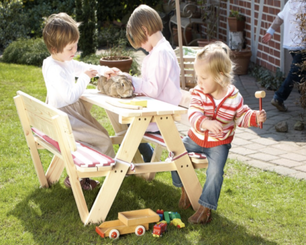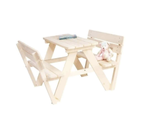 A children's picnic table made of softwood and untreated wood, which is suitable for use by children aged 2-7 both in the summer outdoor area and in the children's playhouse.