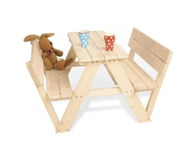 A children’s picnic table made of softwood and untreated wood, which is suitable for use by children aged 2-7 both in the summer outdoor area and in the children’s playhouse.