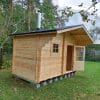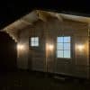 Lillevilla Sauna Kulovesi model features a separate dressing room and steam room. The floor area of this model is 7.6 square meters. The sauna is 3.8 meters wide and 2.0 meters deep. The ridge height is 2.9 meters, and the wall thickness is 44 mm.