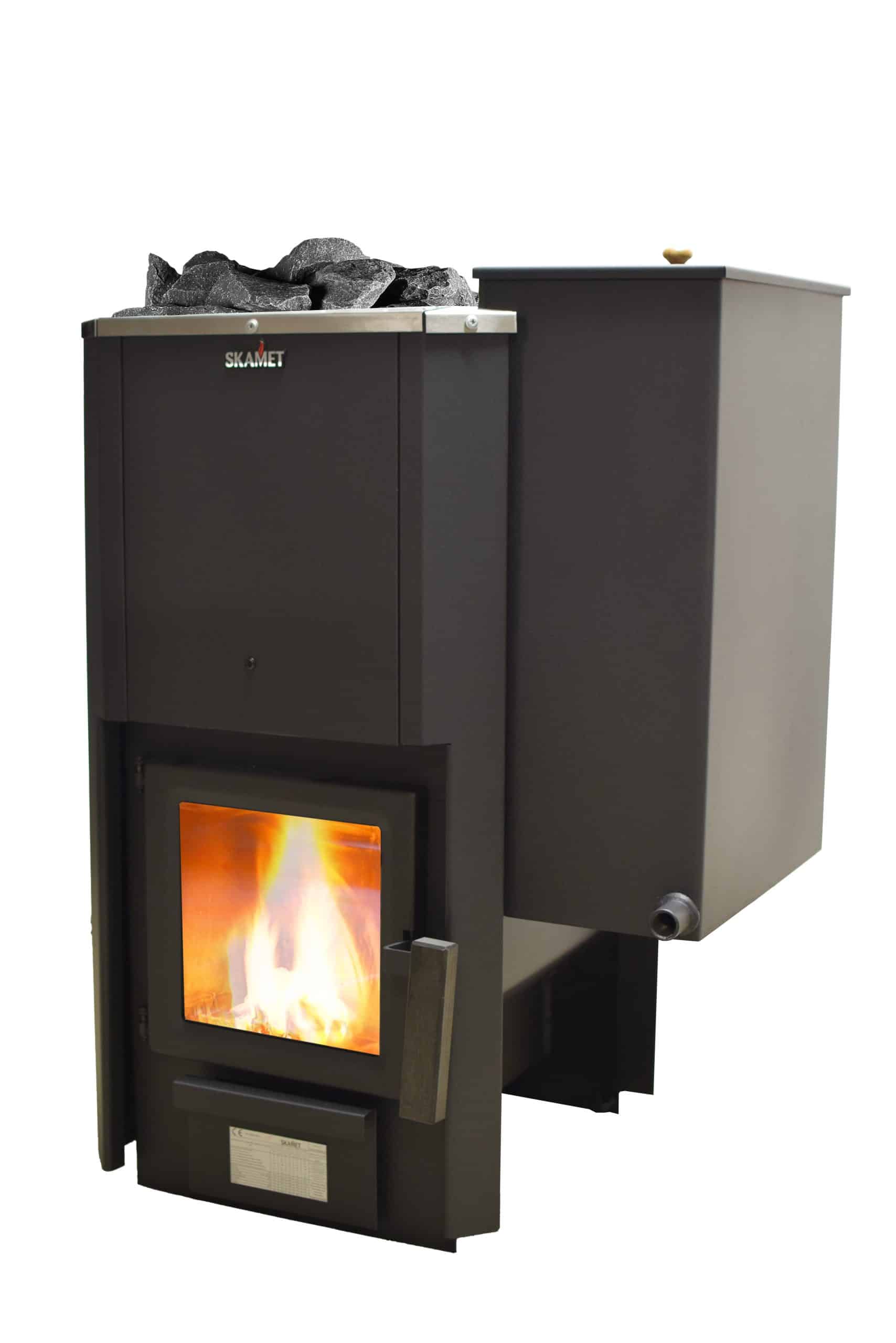 The Skamet P-11640 is available in versions both with and without a water tank, and some models feature a large glass door for an enhanced sauna atmosphere and a view of the fire.