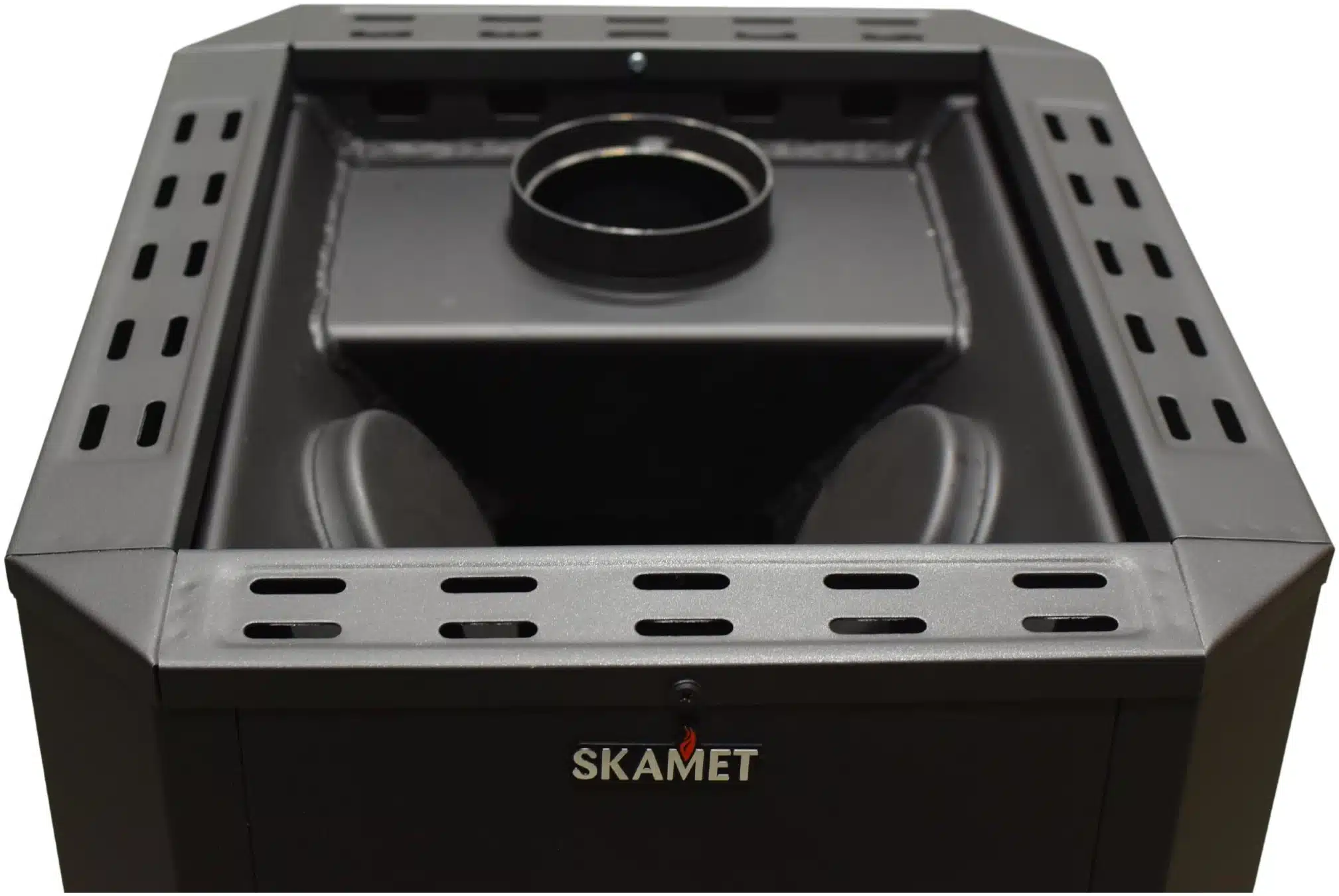 Skamet P-11640 wood-burning sauna heater with optional 40 L stainless-steel water tank for 8–18 m³ saunas, heated from the same room