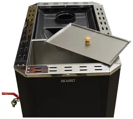 The Skamet P-12025 RV is a powerful wood-burning sauna heater designed for larger sauna rooms of 16–25 m³. It features a stainless-steel 25 L open water tank integrated on the front, combining efficient sauna heating with practical hot-water production. Built for same-room use, the P-12025 RV offers strong, even heat, durability, and traditional sauna comfort in one robust unit.