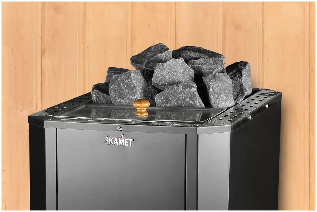 The Skamet P-12025 RV is designed for large sauna rooms and built for heating from within the same room. This model features a 25-litre stainless-steel water tank mounted at the front of the stove, allowing you to conveniently heat water while using the sauna.
