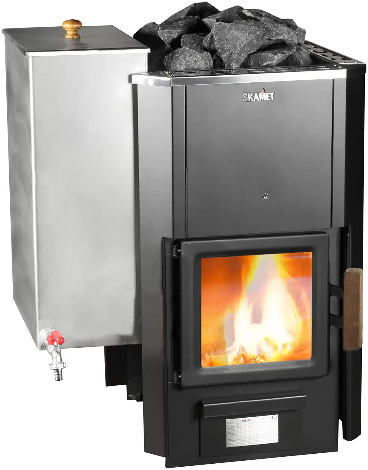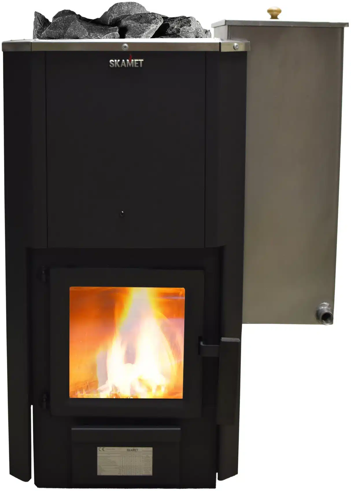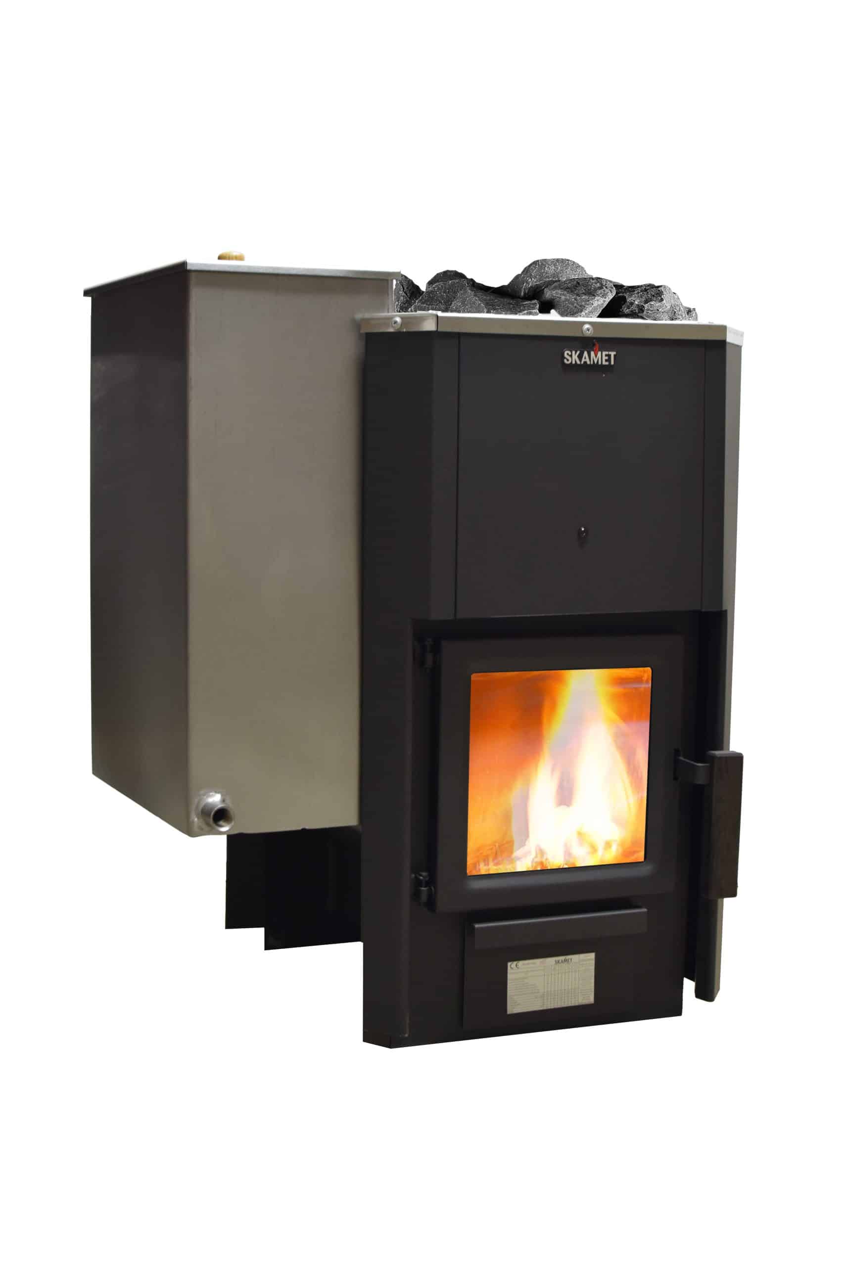 Skamet P-12040 wood-burning sauna heater with metal casing and optional 40 L side water tank for 16–25 m³ saunas, heated from the same room