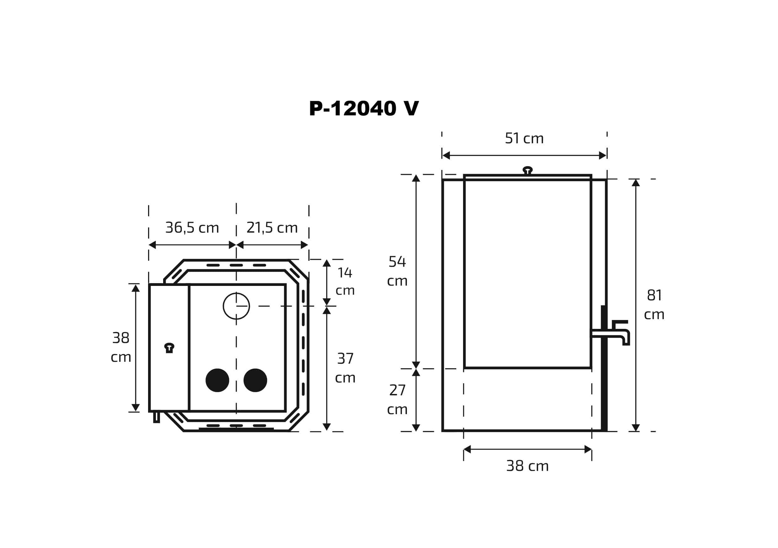 With a stone capacity of around 50 kg and the ability to burn firewood up to 60 cm long, the P-12040 ensures strong heating power and soft, even steam. The heater’s sturdy metal body, coated in black heat-resistant paint, guarantees durability and a traditional wood-fired sauna experience.