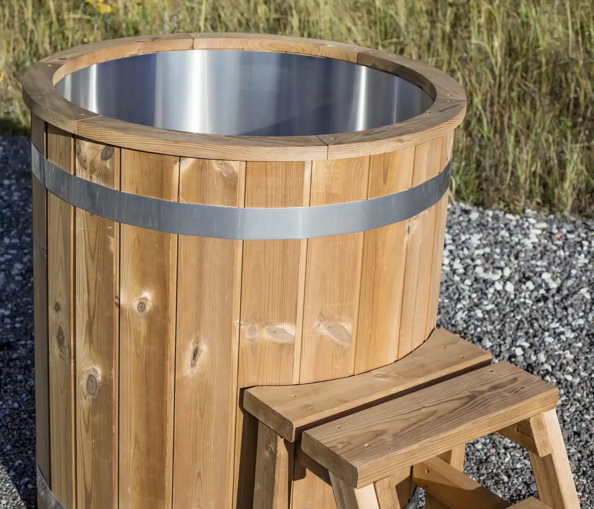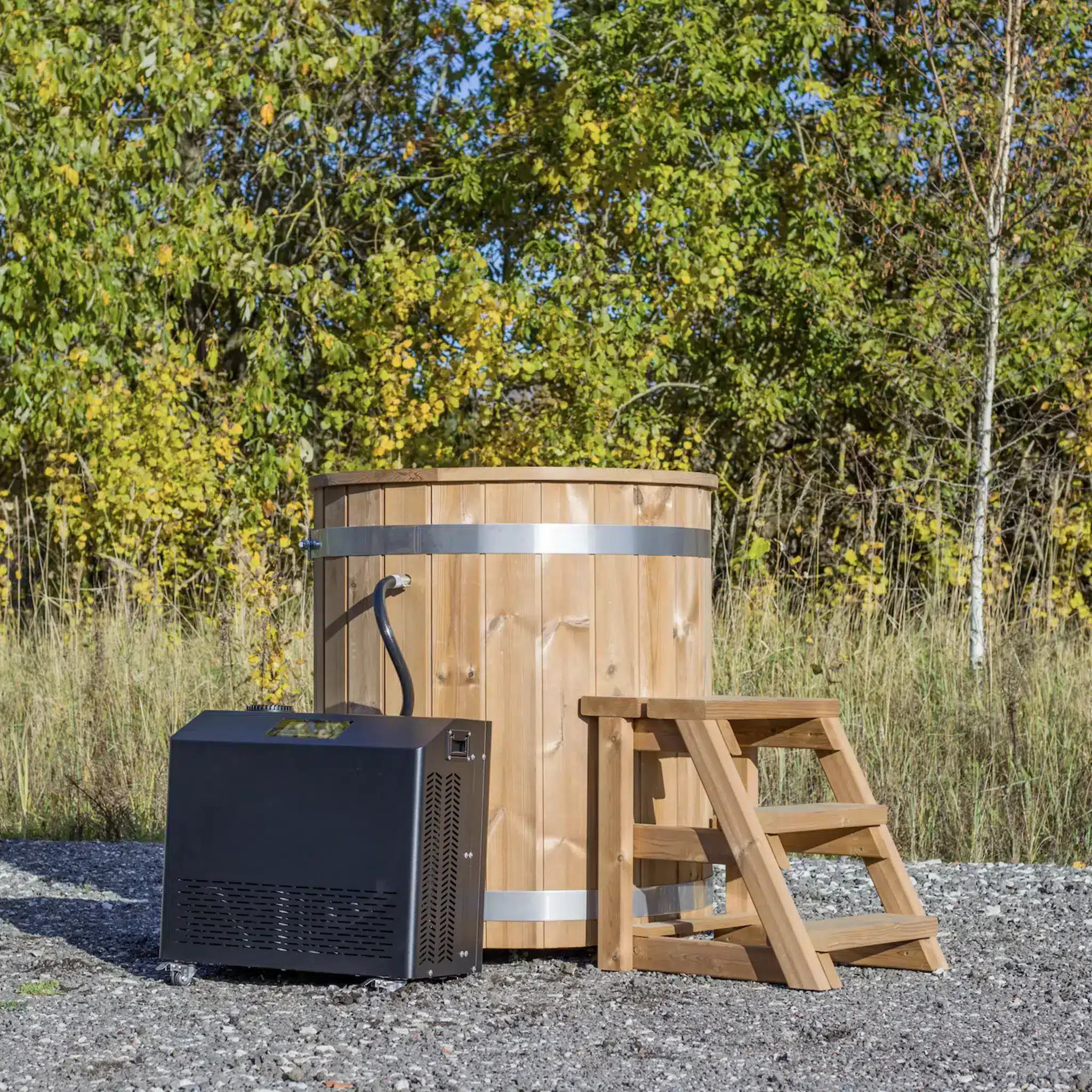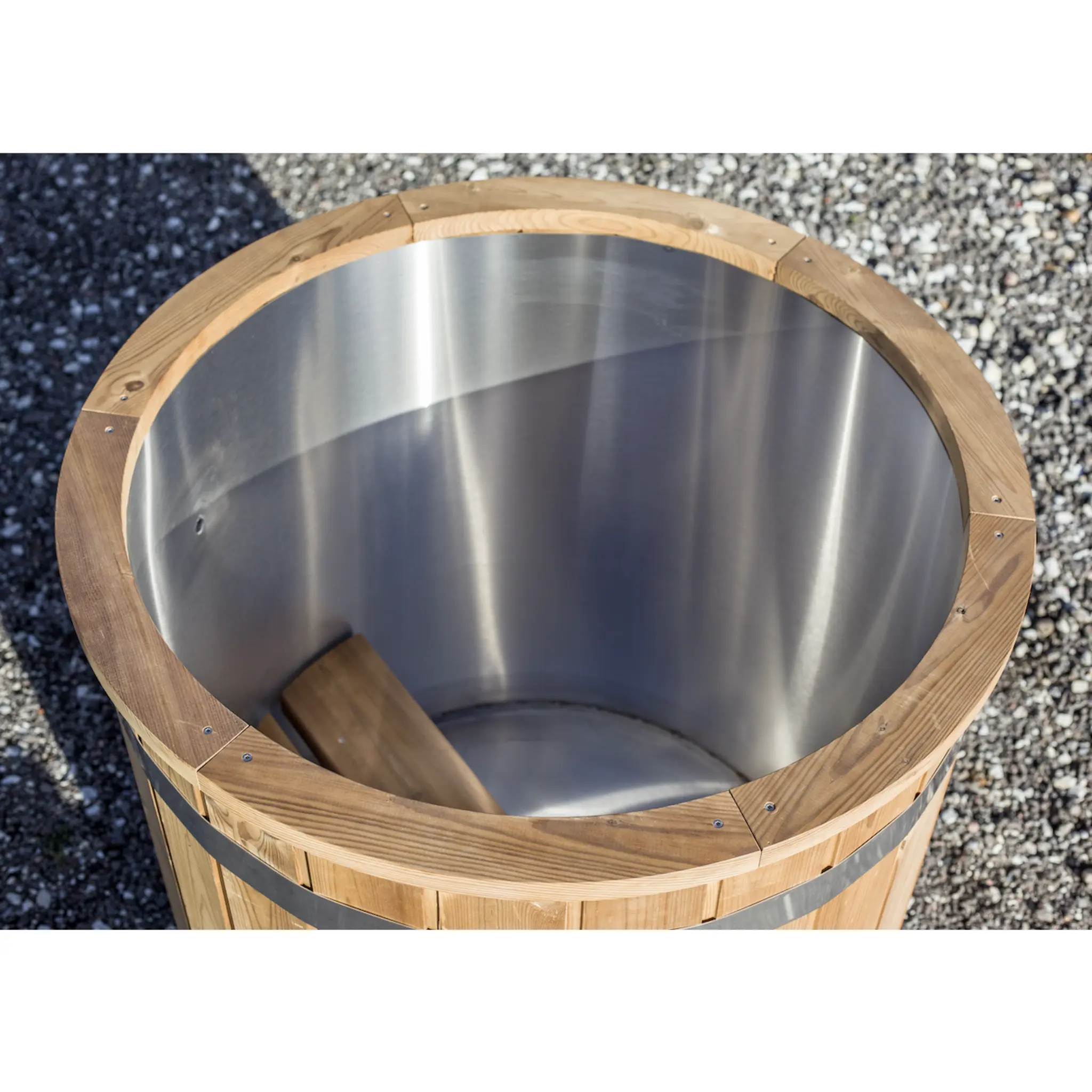 Dive into the ultimate wellness experience with our stainless steel Cold Plunge Tub, crafted for a single user. Featuring a compact diameter of 86 cm and height of 105 cm, it fits seamlessly into any space while providing ample room for a rejuvenating plunge. The 400-liter stainless steel tank ensures exceptional durability and performance, complemented by an elegant 18 mm thermowood exterior for a natural, sophisticated look.