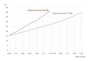 Heating 1400 liters of water from 14°C to 40°C with a 35 kW stove takes approximately 1.5 hours.