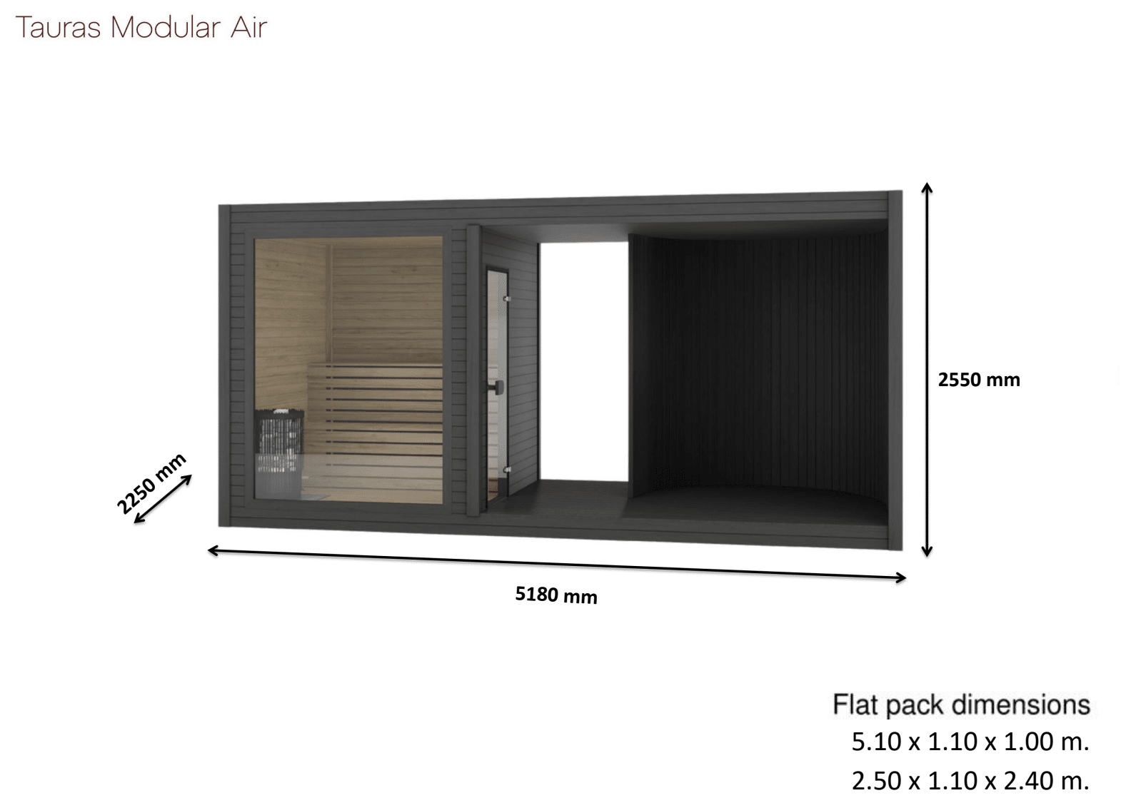 With its open-front design, Tauras Modular Air creates a light, breezy atmosphere while still delivering the full spa experience. One end features a sauna module, while the other can remain open or be fitted with an integrated hot tub or whirlpool, offering flexibility to suit your space and lifestyle. The clean lines and open layout make it an ideal choice for relaxed outdoor settings, where airiness and comfort are key.