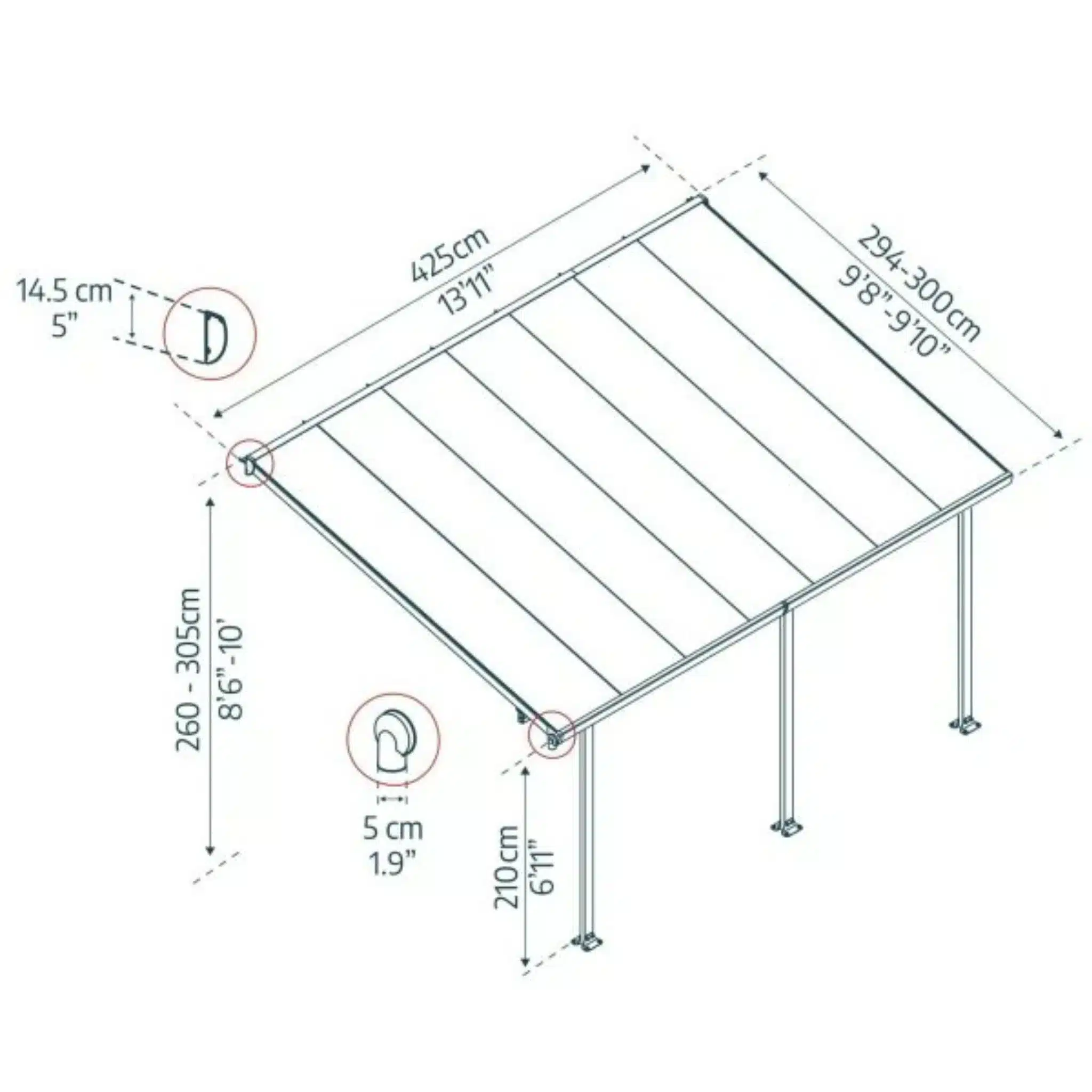 Relax and enjoy the outdoors under the Palram FERIA terrace/canopy. The virtually unbreakable 8 mm polycarbonate roof panels are 100% UV-protected and block harmful UV radiation. The patented screwless roof assembly system is specifically designed to prevent rain/dew leaks. The terrace roof is designed to be easily assembled by two people using the Click N’ Lock roof system for safe and easy assembly, preventing leaks.