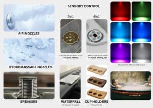 Elevate your experience with features like hydro-massage, an air system, and an immersive sound system. Add ambiance with sensory control and a calming waterfall feature.